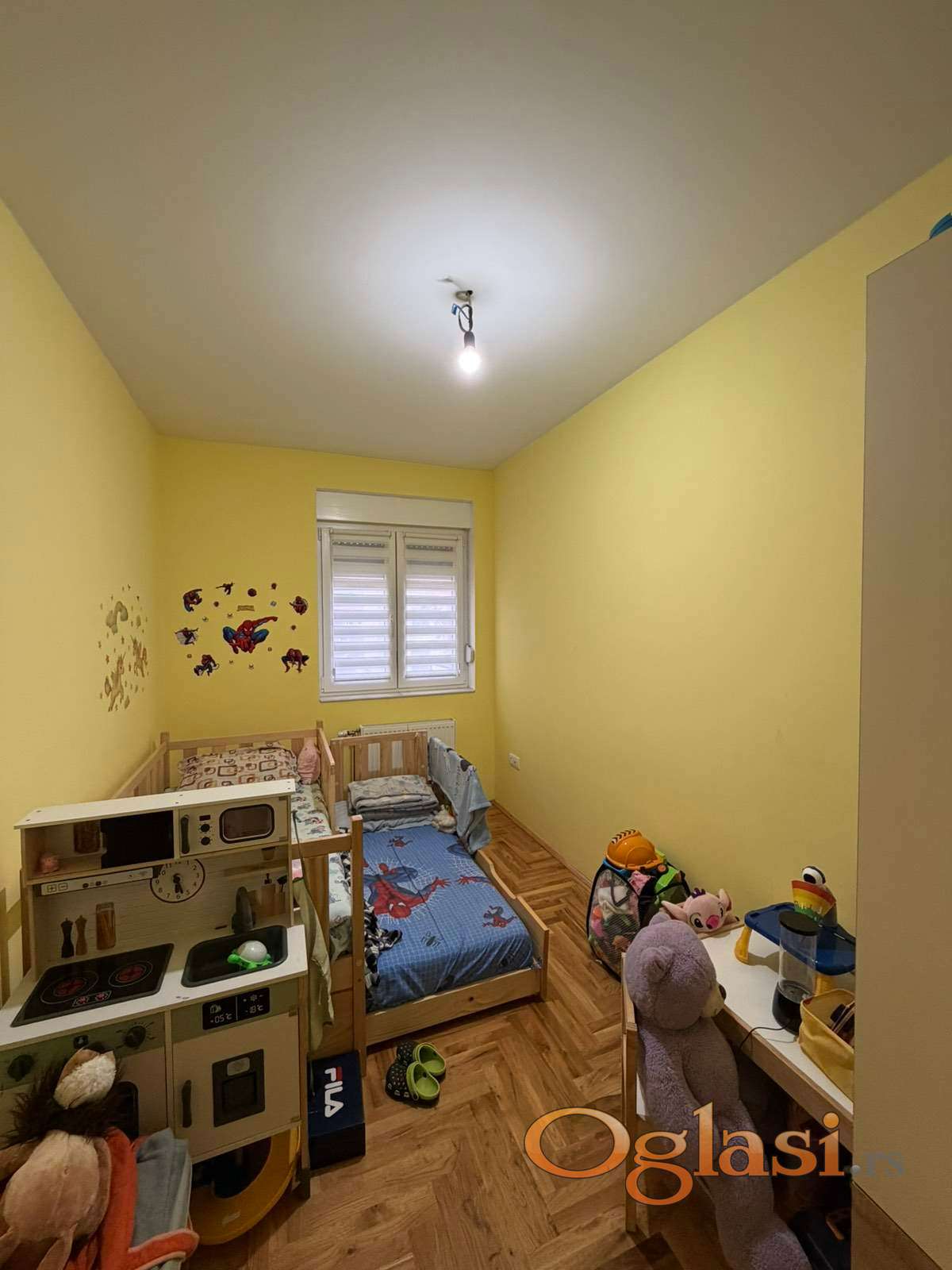 Raspored funkcionalan, u sve sobe se ulazi iz hodnika. Dve spavaće sobe, kupatilo, dnevna soba sa trpezarijom i kuhinjom koja ima izlaz na terasu. I kupatilo i kuhinja imaju prirodnu ventilaciju!