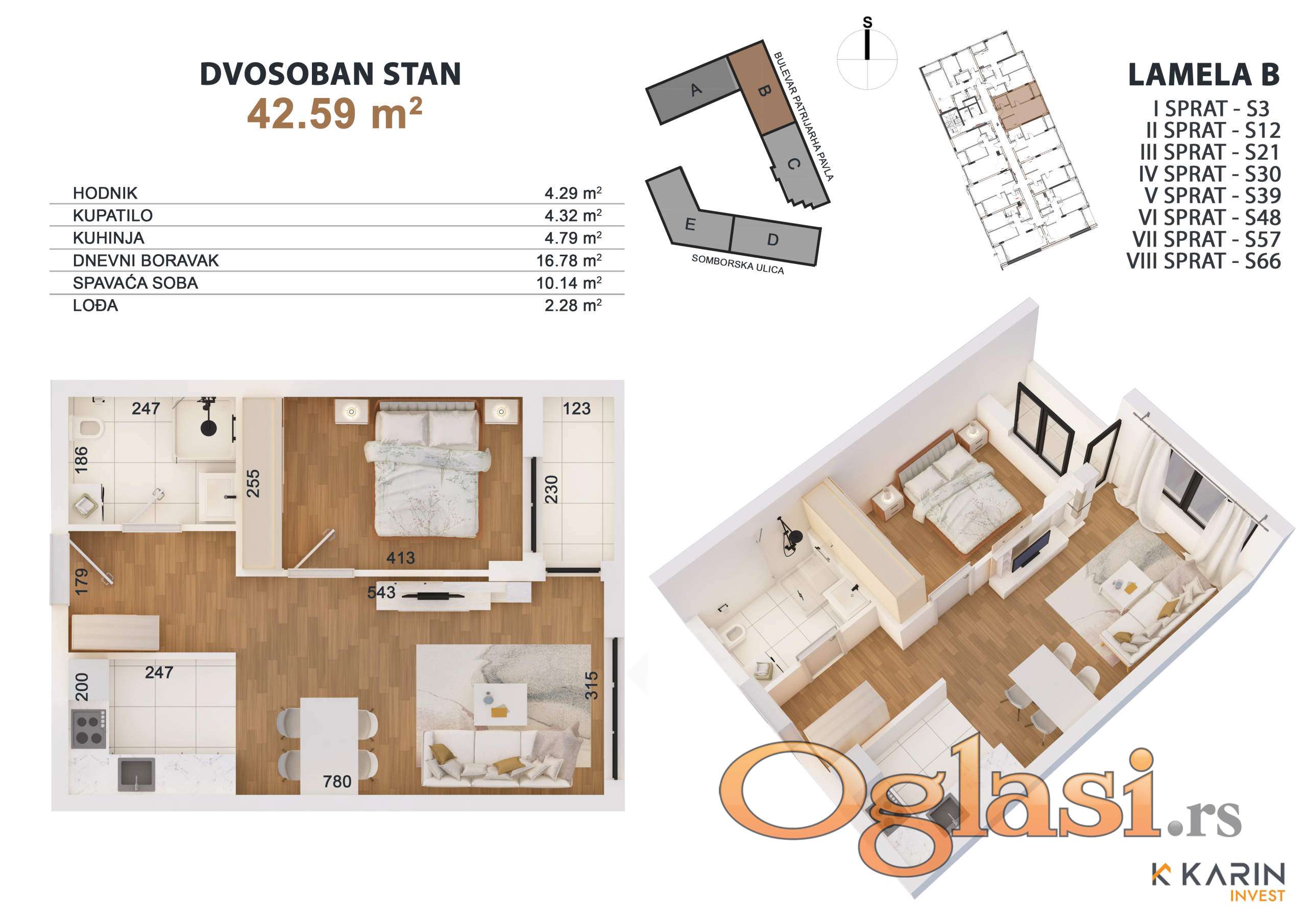Prodaje se dvosoban stan broj 21 na trećem spratu ulično orjentisan ( Istok ) u lameli B projektovane površine 42.59m2 . Stan odličnog klasičnog rasporeda . Sastoji se od klimatizovanog dnevnog boravka sa kuhinjom, spavaća soba, kupatilo, terasa.