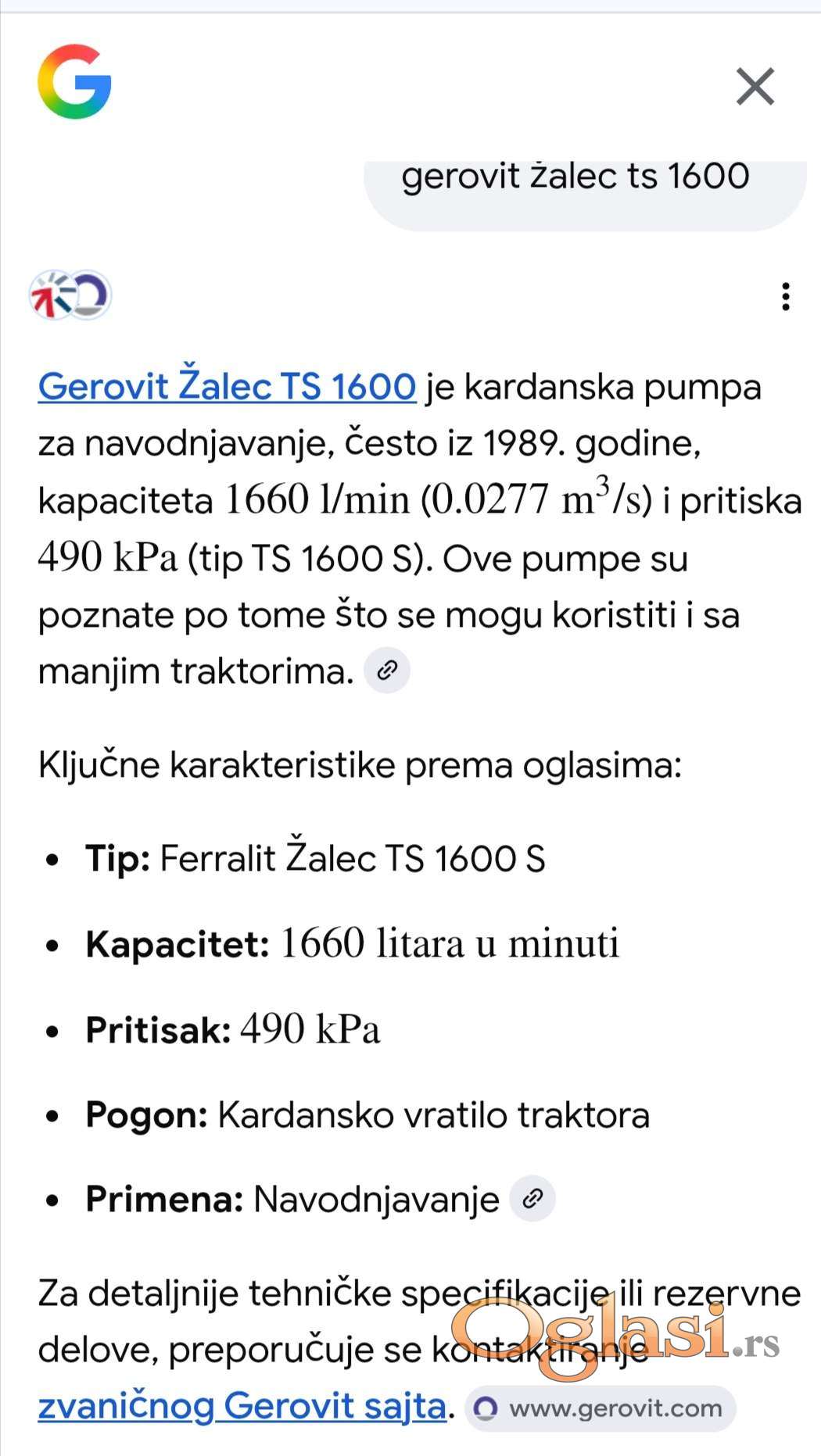 Prodajem kardansku pumpu za navodnjavanje Ferralit Žalec Slovenija tip TS 1600 S, god. 1989.