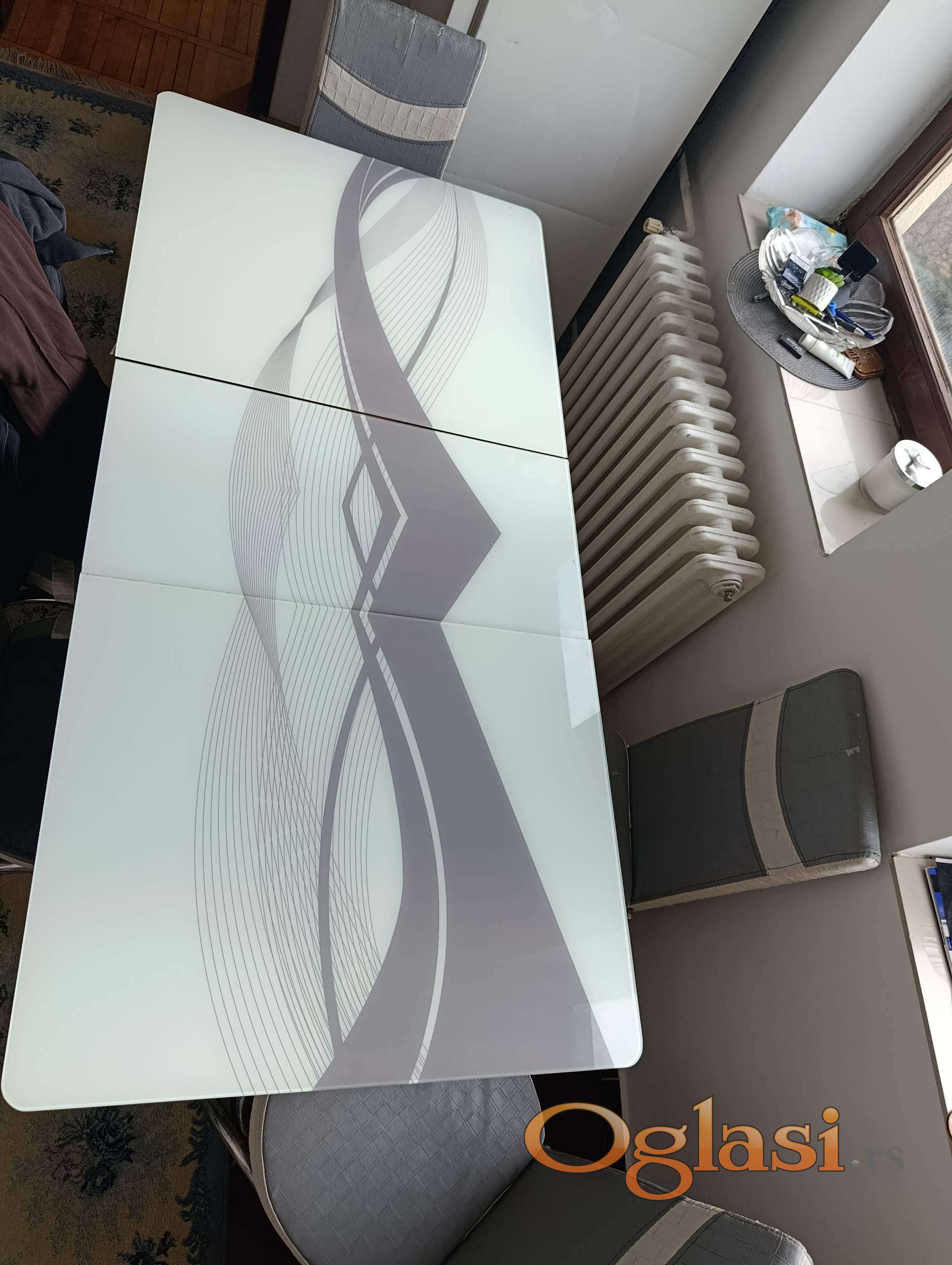 Stakleni sto na rasklapanje, sto ima metalne noge, uz sto idu 6 stolica koje su ostecene