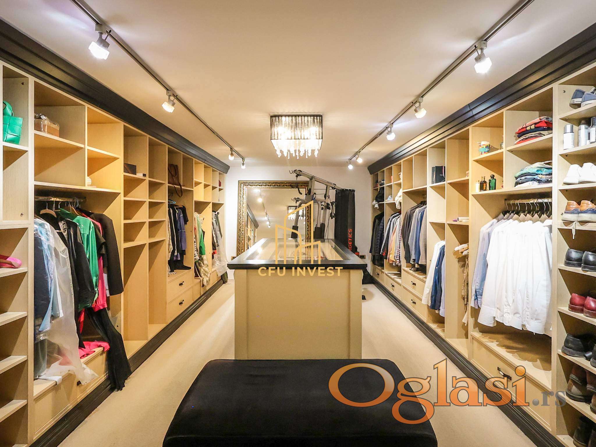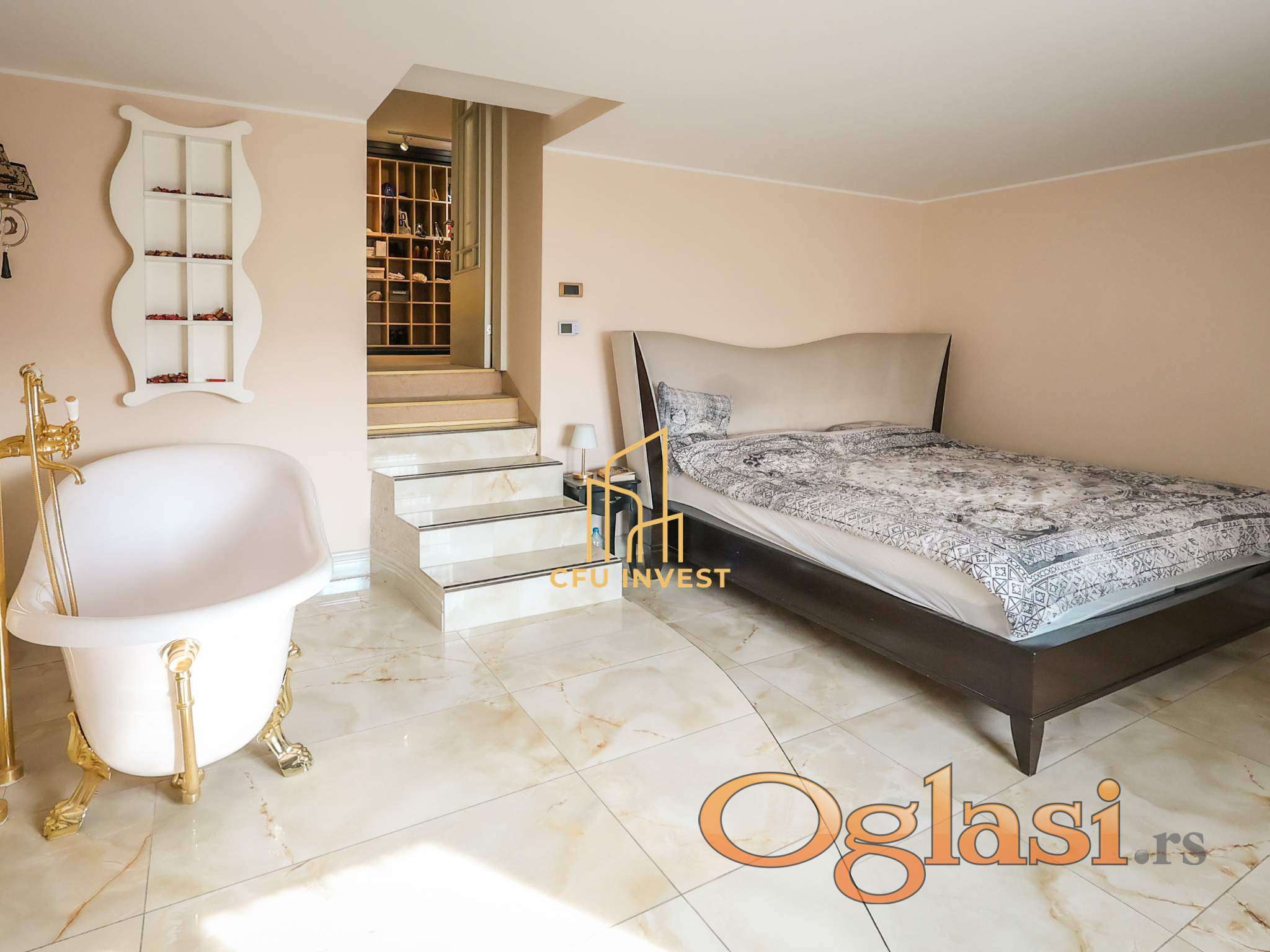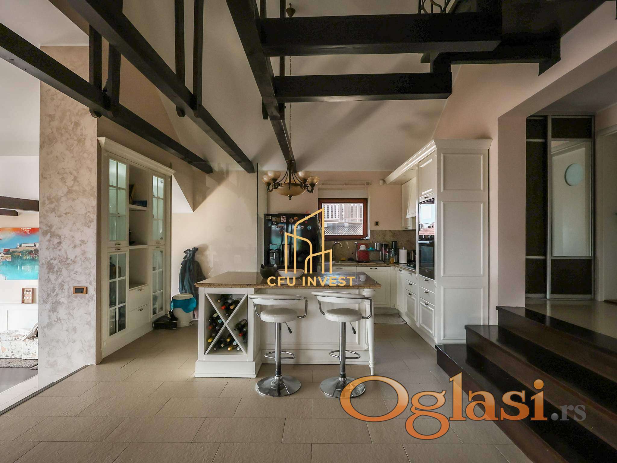 Kuća se prostire na tri etaže i sastoji se od prostranog dnevnog boravka visine 4, 5 m, kuhinje sa trpezarijom za 10+ osoba, ostave, tri kupatila, pet spavaćih soba i prostranog "walk-in" garderobera.