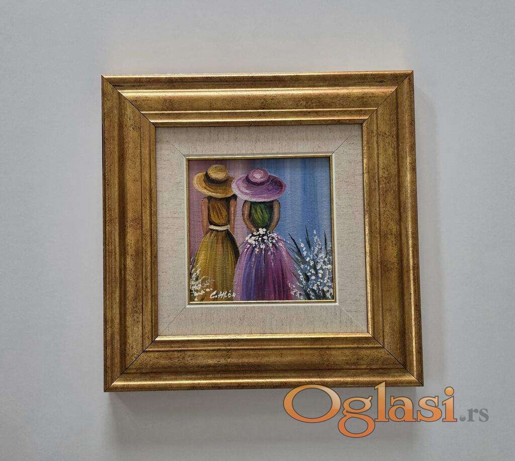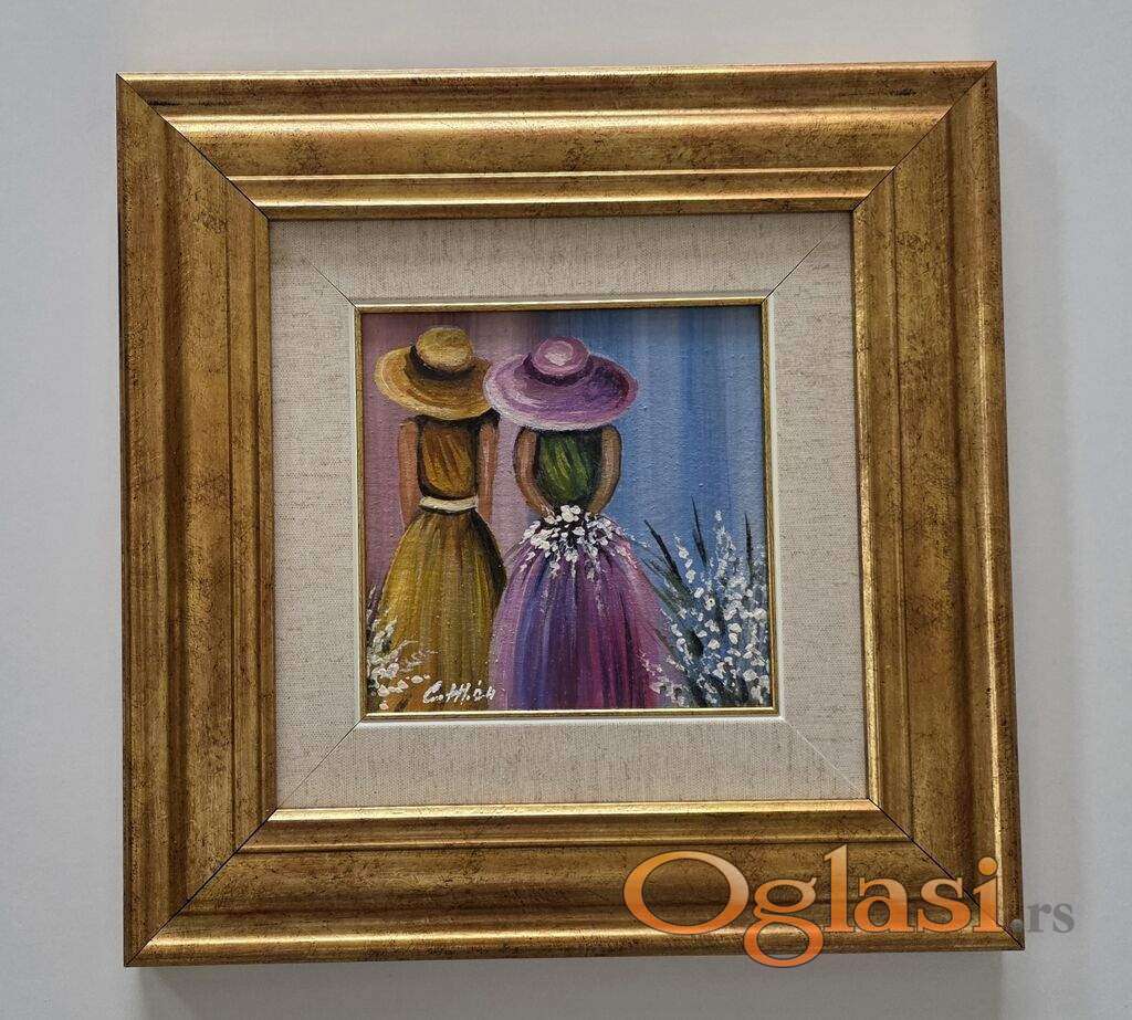 Ulje na platnu Dva sesira, jedna prica. Prelepo umetnicko delo. Slika je uramljena u jako lep ram, dimenzije slike sa ramom 37 x 37. Privatna kolekcija.