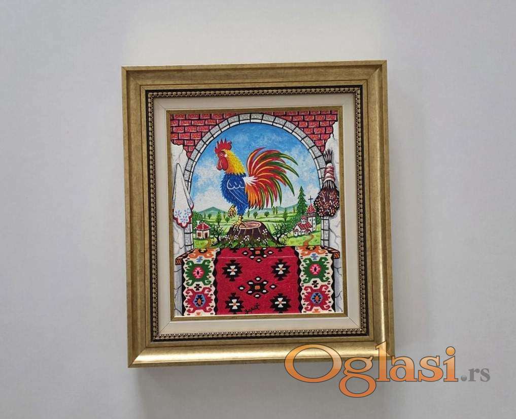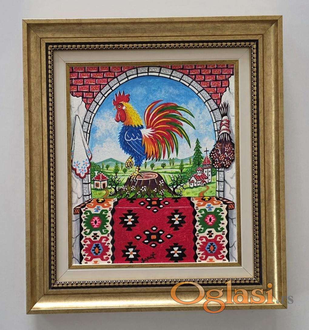Naiva, ulje na platnu Srpski petao. Prelepo umetnicko delo. Slika je uramljena u jako lep ram, dimenzije slike sa ramom 42 x 38. Privatna kolekcija.