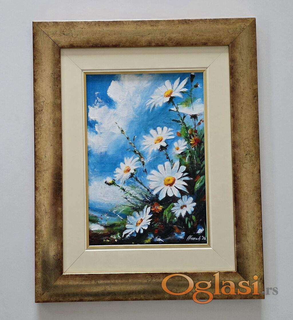 Slika Cvetni trenutak leta, tehnika akril na platnu. Prelepo umetnicko delo. Slika je uramljena u jako lep ram, dimenzije slike sa ramom 41 x 33. Privatna kolekcija.