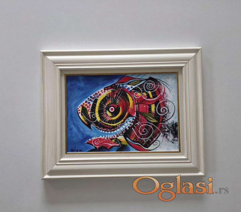 Slika Riba u pokretu, tehnika akril na platnu. Prelepo umetnicko delo. Slika je uramljena u jako lep ram, dimenzije slike sa ramom 50 x 40. Privatna kolekcija.