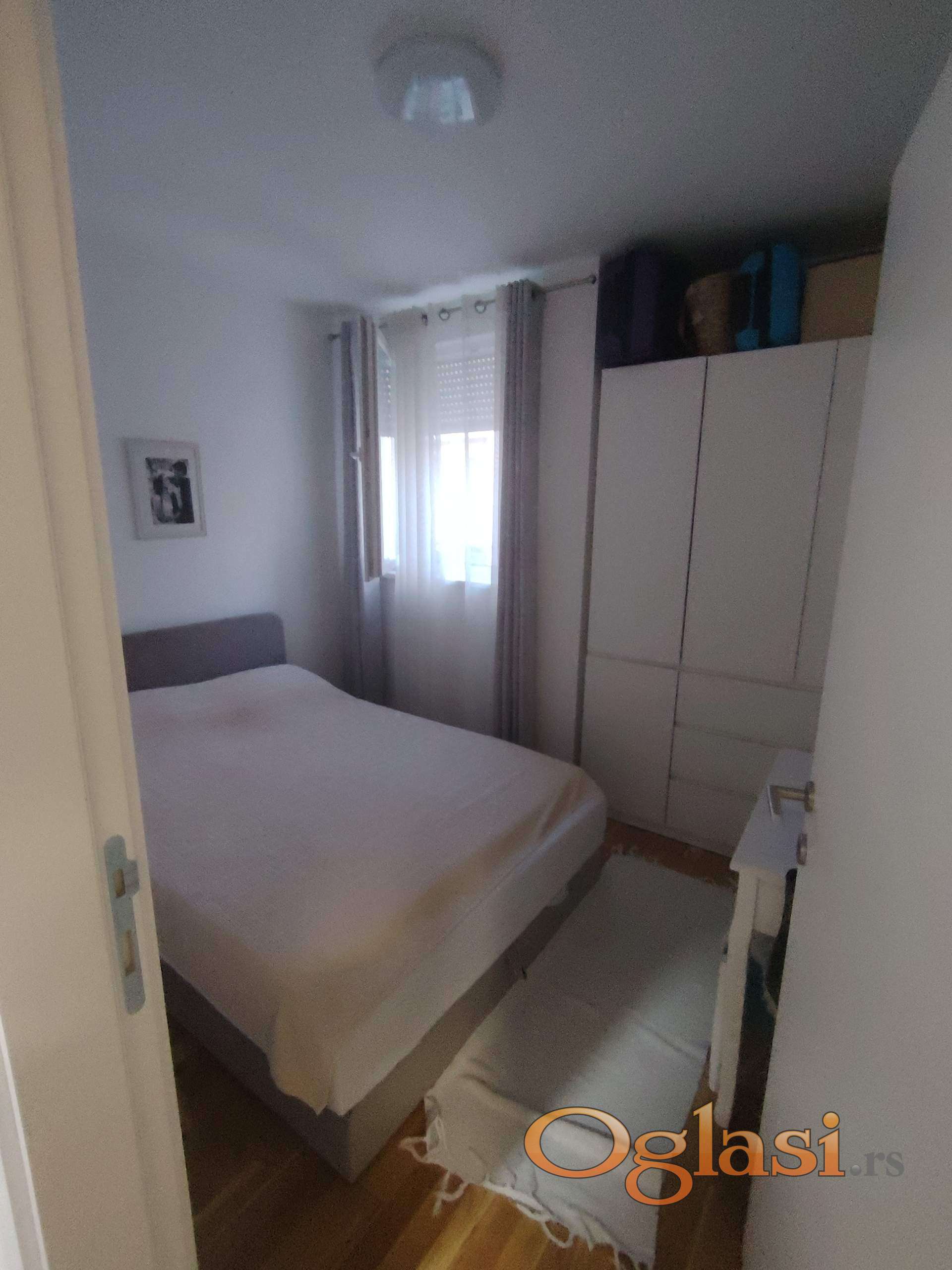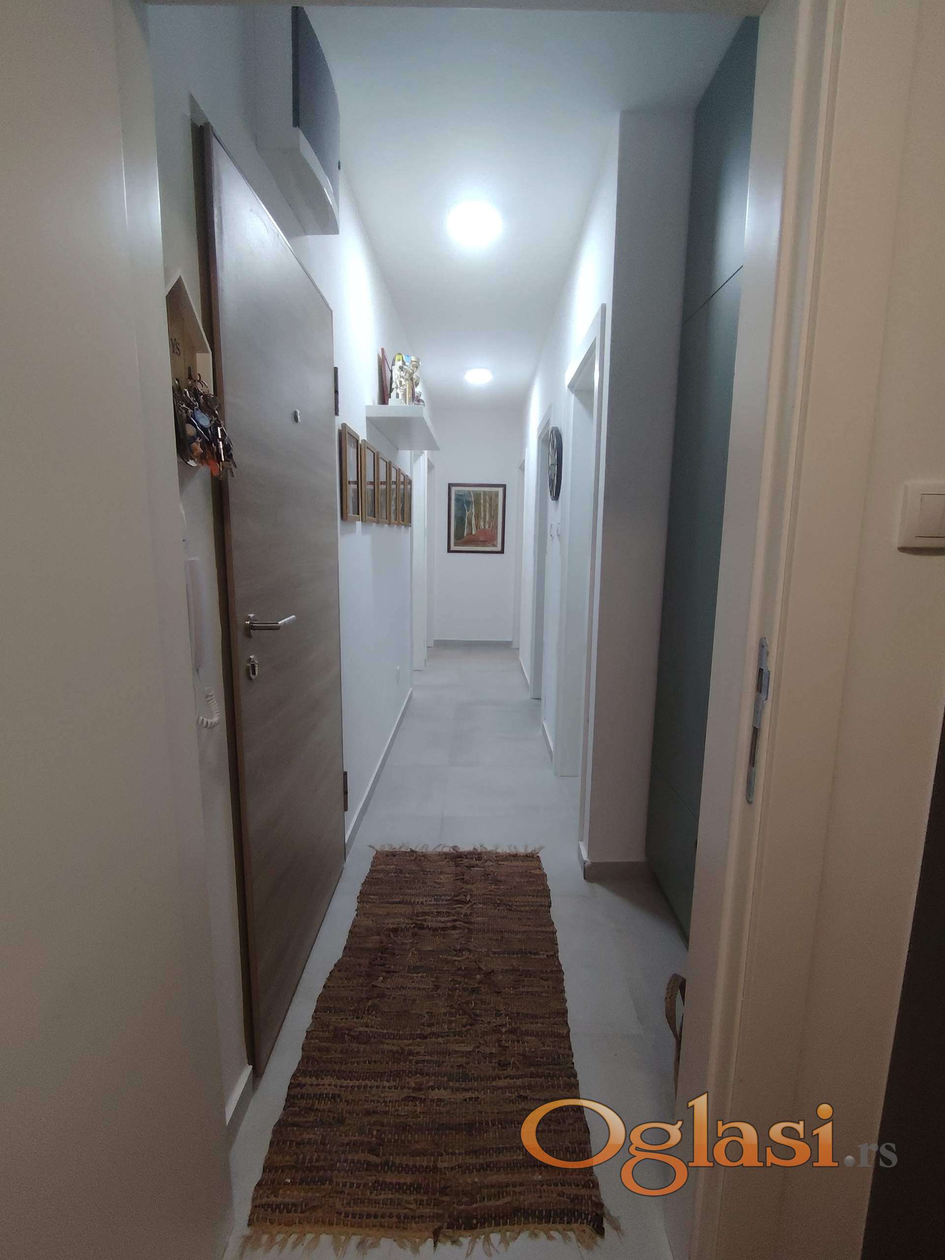 Stan se prodaje delimično namešten: u cenu je uključena kvalitetna kuhinja sa kompletnom tehnikom, ugradni ormari, cipelarnik, kao i potpuno opremljeno kupatilo.