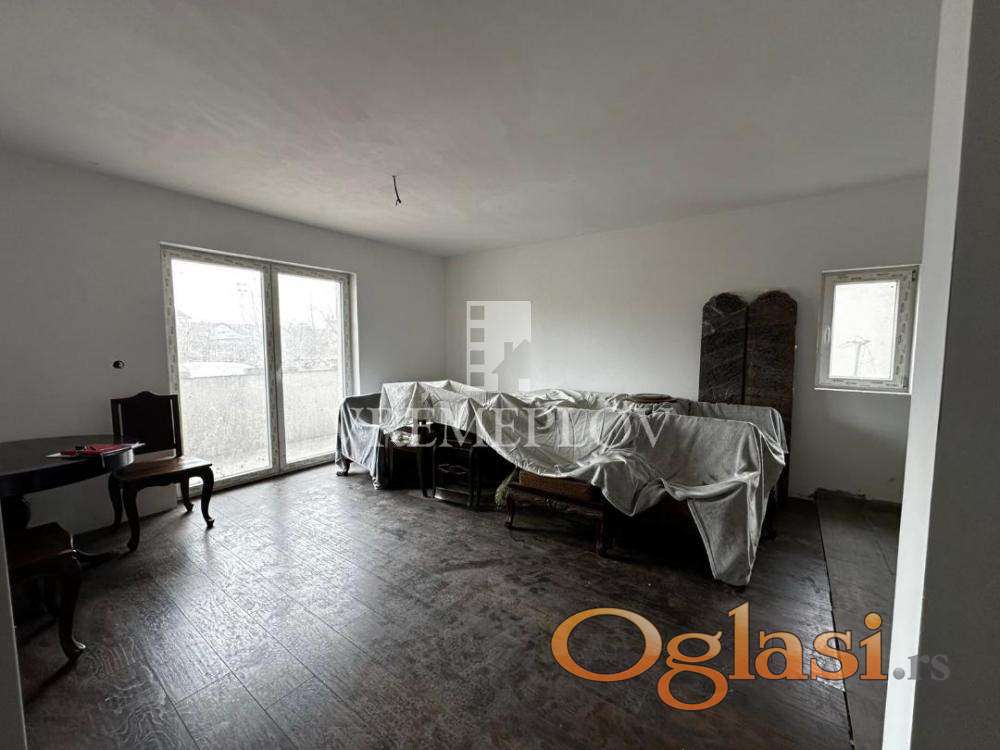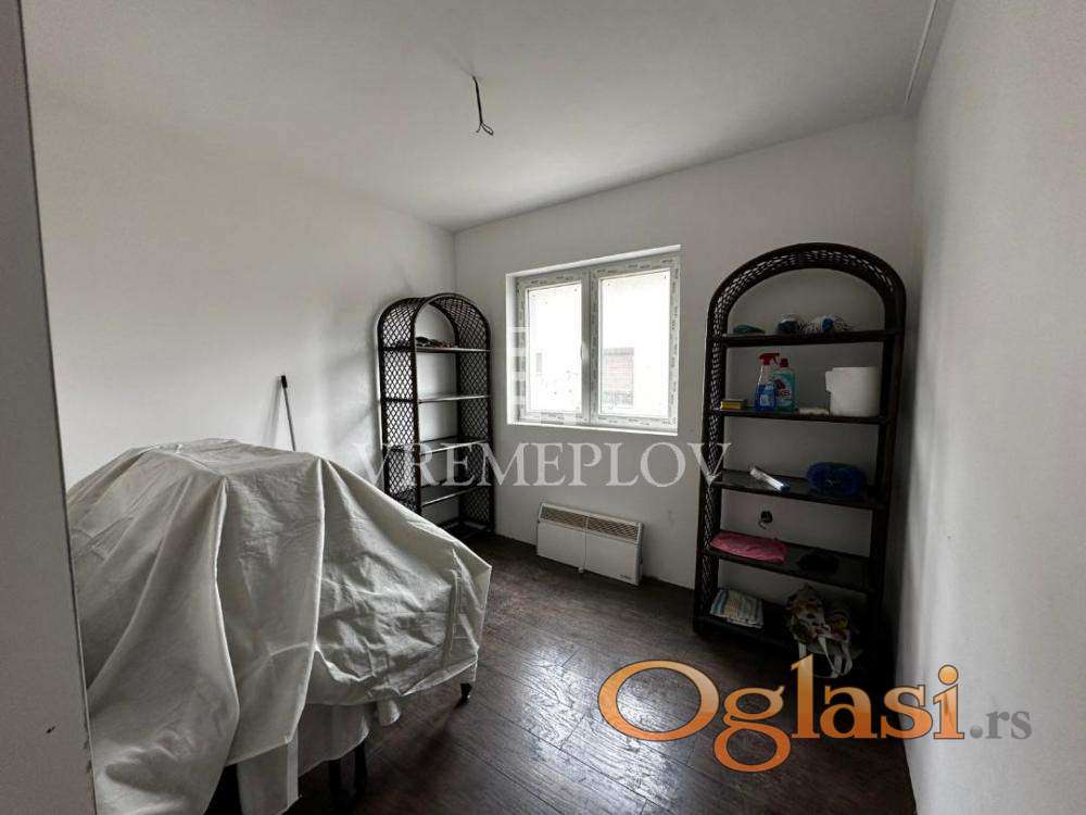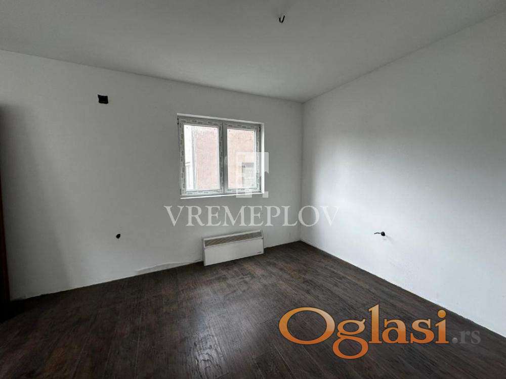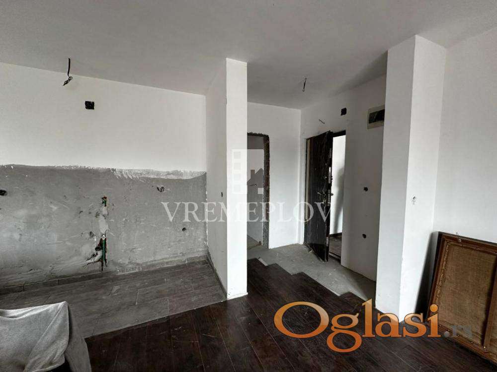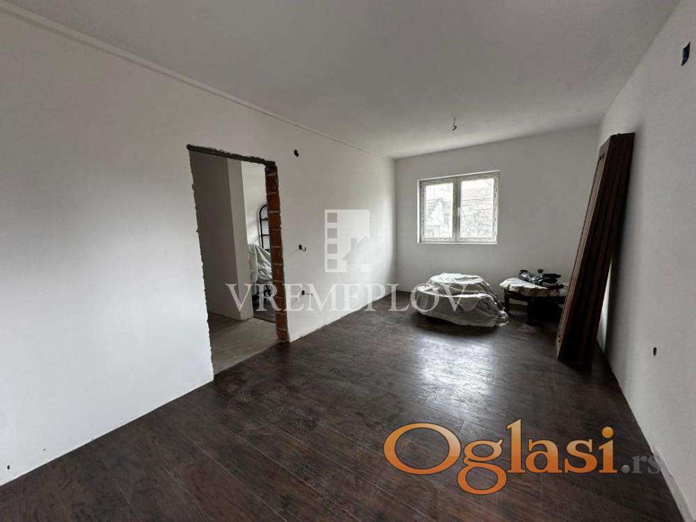 Stan u naselju Krnjača po strukturi dvoiposoban ukupne površine 65,85 m2.Stan u izgradnji u završnoj fazi, mogućnost dogovora oko završnih radova u kupatilu i kuhinji.Stan se sastoji od dnevne sobe sa kuhinjom i trpezarijom, dve spavaće sobe,hodnika,kupatila i terase. U procesu legalizacije.
