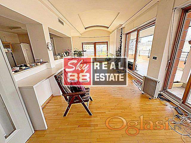 7,0 Vracar , blizina Metropola , Krunske , Pravnog fakulteta , 415m2 ( 110m2 + 305m2 ) , 6 / 6 , lift u zgradi ( za stanare ) + lift iskljucivo za ovaj stan , cg , reprezentativan , luksuzan poslovni prostor - penthouse , sam na spratu , rentira se iskljucivo za poslovni prostor - kancelarije , racunarska mreza sa serverom , trostrana orijentacija , velike staklene povrsine , izrazito svetao , visina plafona od 3m do 5,4m , Hrastov parket , Alu drvo stolarija , Villeroy Boch i Geberit sanitarije , tri prostrane terase , odlicna , lepo odrzavana zgrada i ulaz , gradnja 2007. godine , 4 garazna mesta u ceni rente stana ( opciono plus dva garazna mesta i dva parking mesta na ulici ) .