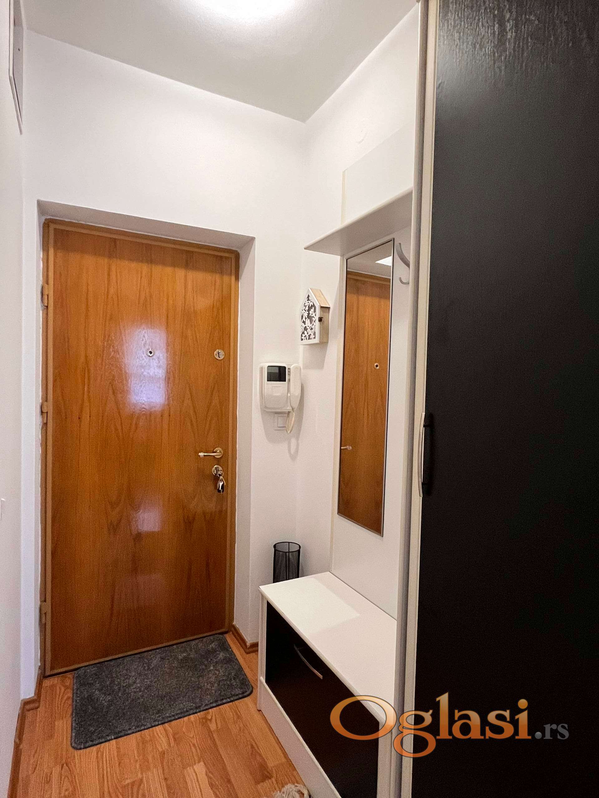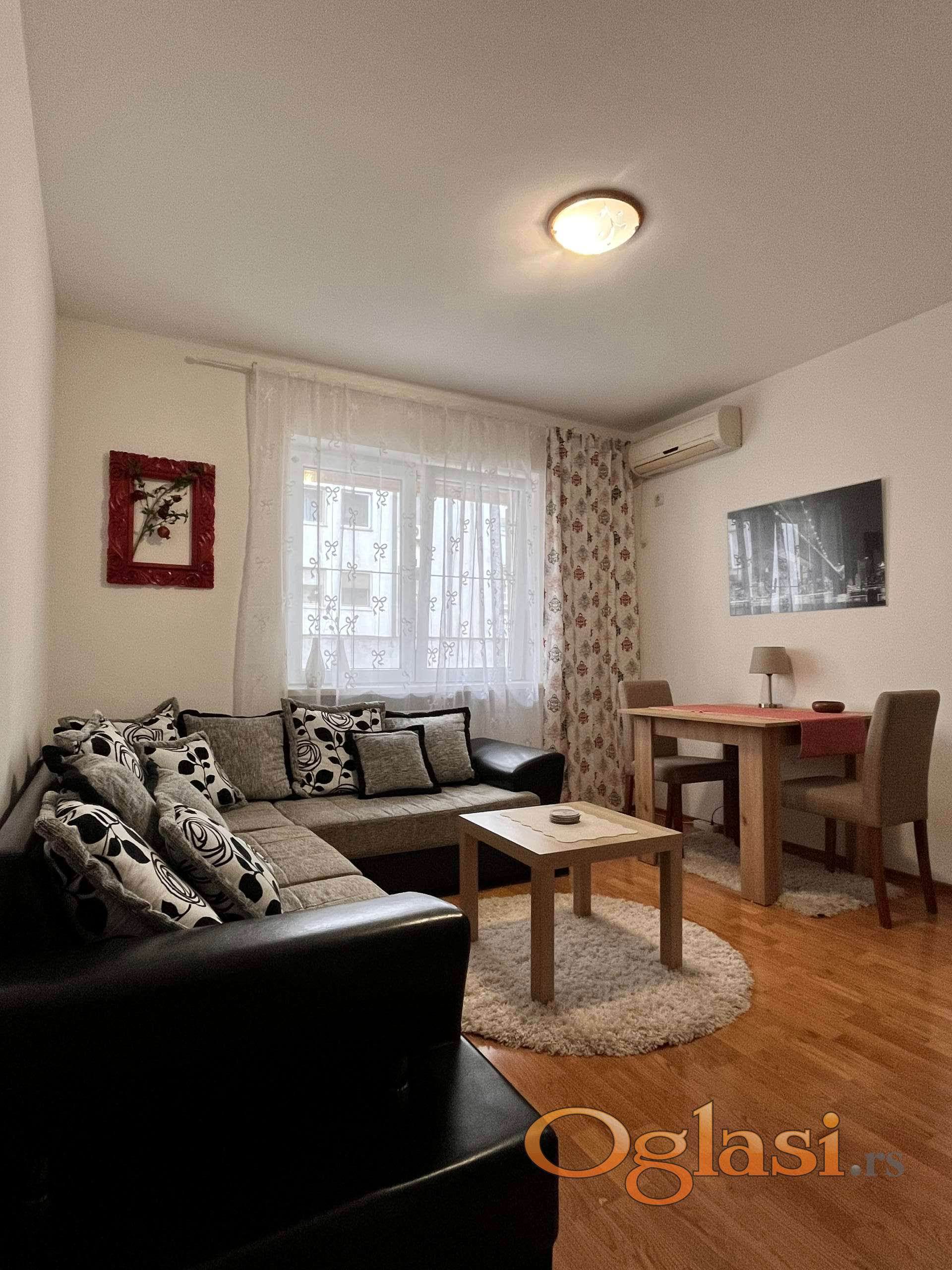 Struktura stana: odvojeno predsoblje, svetao dnevni boravak, odvojena kuhinja, spavaća soba i veliko kupatilo. Stan je opremljen novim nameštajem i tehnikom. Grejanje je centralno, a stan poseduje i klima uređaj. U cenu zakupa uključeno je natkriveno parking mesto.