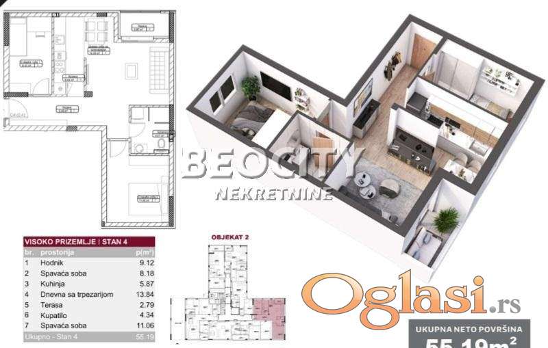 Agencijski ID: 130731, VPR/IV, lift, terasa. Prodaja LIMAN 5, NOVI *STAN SA STILOM* 55,19 m2, u izgradnji. Povrat PDV. 2 spavaće sobe 11,06 m2 i 8,18 m2. Dnevni boravak 13,84m2 i šarmantna kuhinja dvostrano zidana sa ulazom iz hodnika 5,87 m2. Svetlost u kuhinju dolazi od velikog dvokrilnog prozora. Tu je predvidjena i trpezarija. Hodnik je posebno lep, dugačak i dovoljno širok da staje uži plakar od vrha do dna, veličine 9,12 m2.. Visoko prizemlje je dosta odignuto i bezbedno jer se ispod nalaze suterenske prostorije i ovaj stan ima dosta svetlosti jer su i terasna vrata dosta visoka i široka, isto dvokrilno otvaranje, kao i svi prozori u stanu. Stan je okrenut ka jugu. Useljiv oktobar ove godine. Grejanje GAS. U zgradi LIFT. Luksuzno opremljen. Blizina fakulteta, TC Promenada, restorana, marketa. Cena je bez uračunatog pdv. Odluka za nov stan, uvek je dobra odluka. Više informacija na: www.beocitynekretnine.rs Agencijska provizija 3%. Telefoni: 021/399-0210 • 060/399-0210. Kontakt van radnog vremena: kancelarija@beocitynekretnine.rs