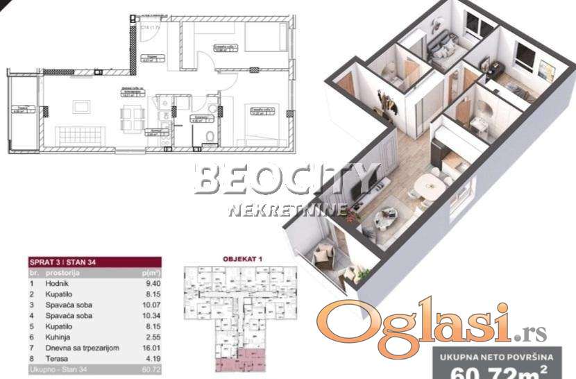 Agencijski ID: 130732, III/IV, lift, terasa. Prodaja LIMAN 5, NOVI *STAN SA STILOM* 60,72 m2, u izgradnji. Povrat PDV. 2 spavaće sobe 10,07m2 i 10,34m2. 2 KUPATILA: 8,15 m2 i 8,15 m2. Dnevni boravak 16,01 m2 . I prelepa terasa od 4,19 m2. Stan je dvostrano okrenut što mu daje poseban šarm! Useljiv oktobar ove godine. Grejanje GAS. U zgradi LIFT. Luksuzno opremljen. Blizina fakulteta, TC Promenada, restorana, marketa. Cena je bez uračunatog pdv. Odluka za nov stan, uvek je dobra odluka. Više informacija na: www.beocitynekretnine.rs Agencijska provizija 3%. Telefoni: 021/399-0210 • 060/399-0210. Kontakt van radnog vremena: kancelarija@beocitynekretnine.rs
