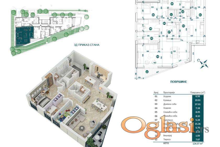 Ukupna površina oba stana iznosi 124,37 m² sa terasom.