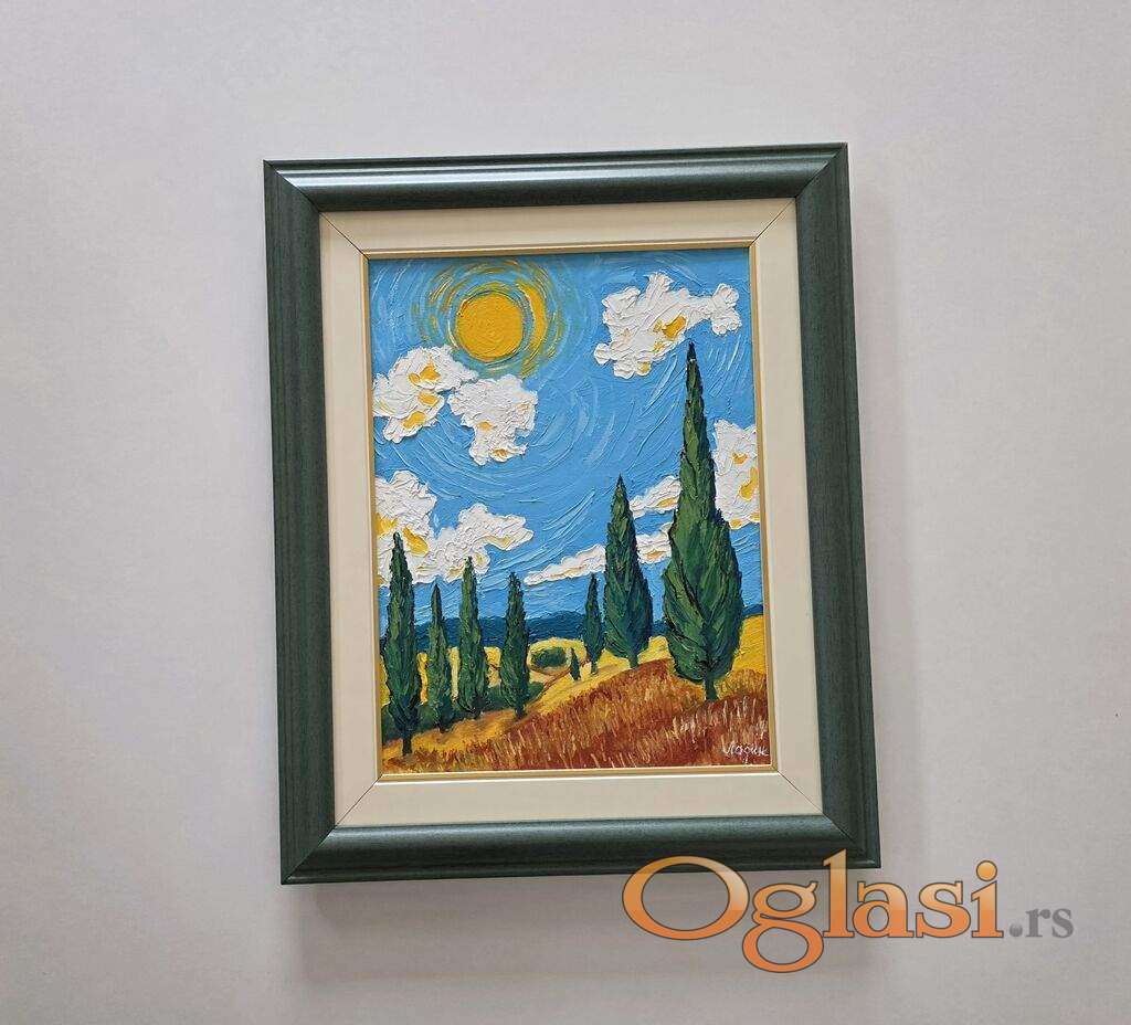 Ulje na platnu Zlatno sunce nad cempresima, prelepo umetnicko delo. Slika je uramljena u jako lep ram, dimenzije slike sa ramom 55 x 45. Privatna kolekcija.