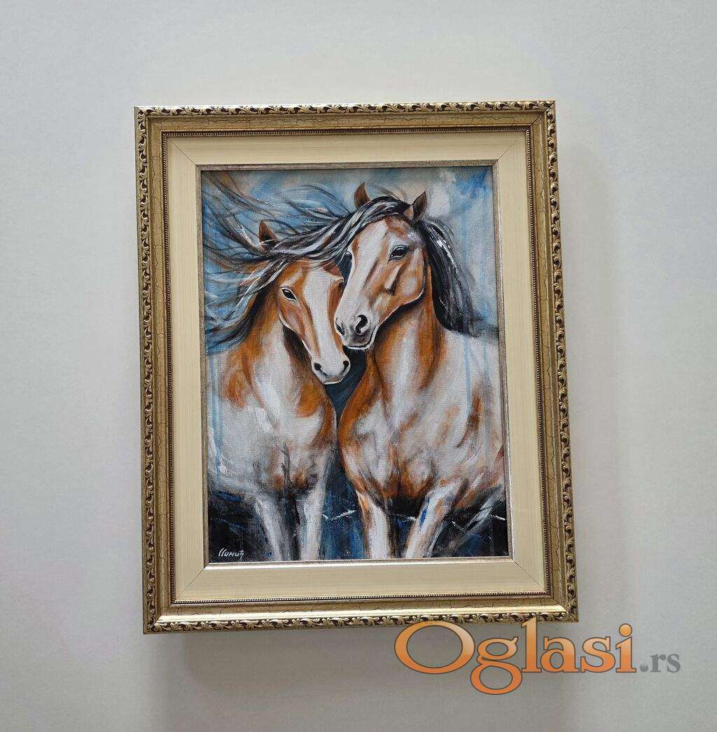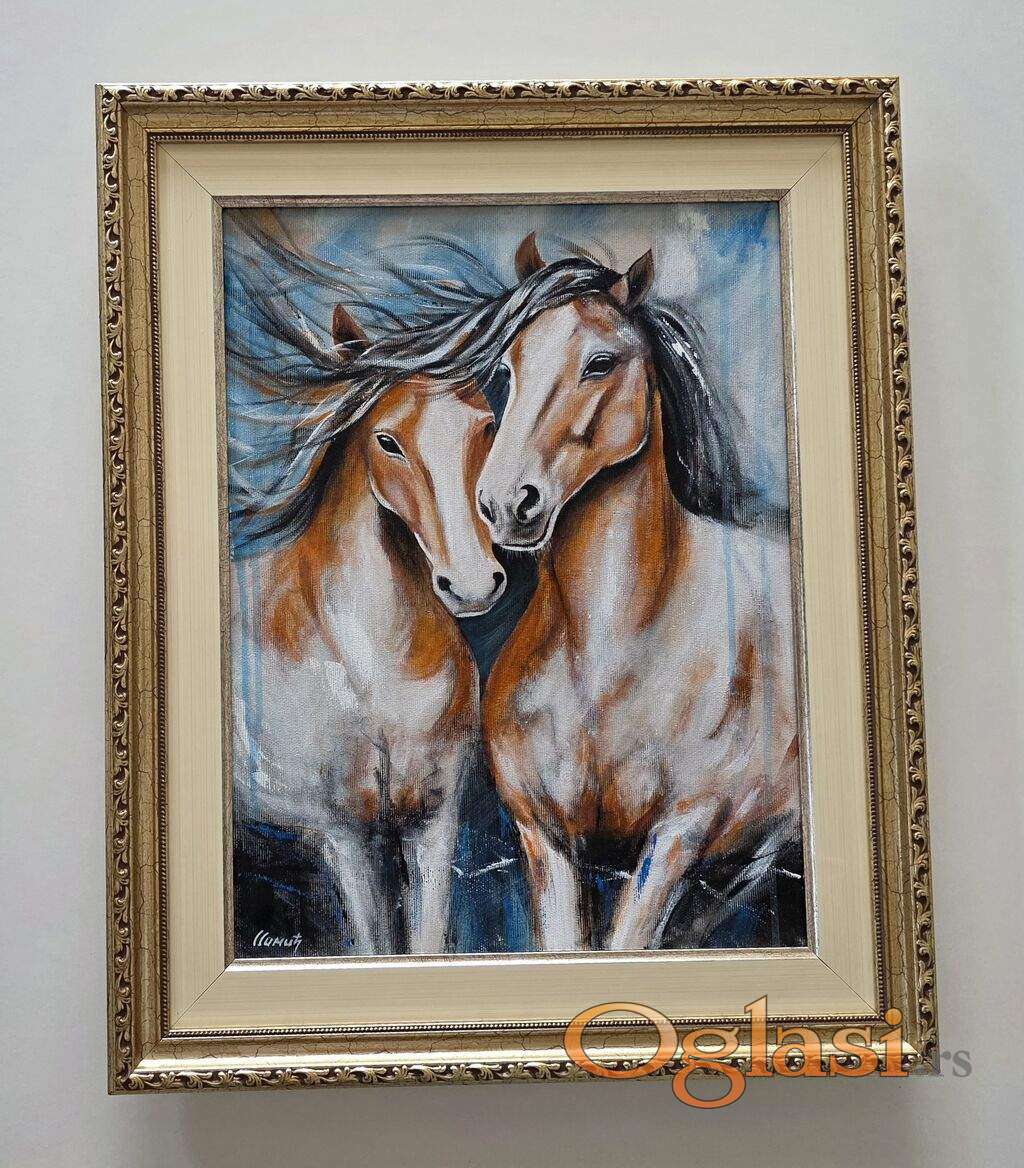 Slika Zaljubljeni konji, tehnika akril na platnu. Prelepo umetnicko delo. Slika je uramljena u jako lep ram, dimenzije slike 53 x 43. Privatna kolekcija.