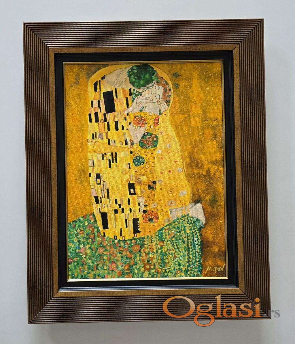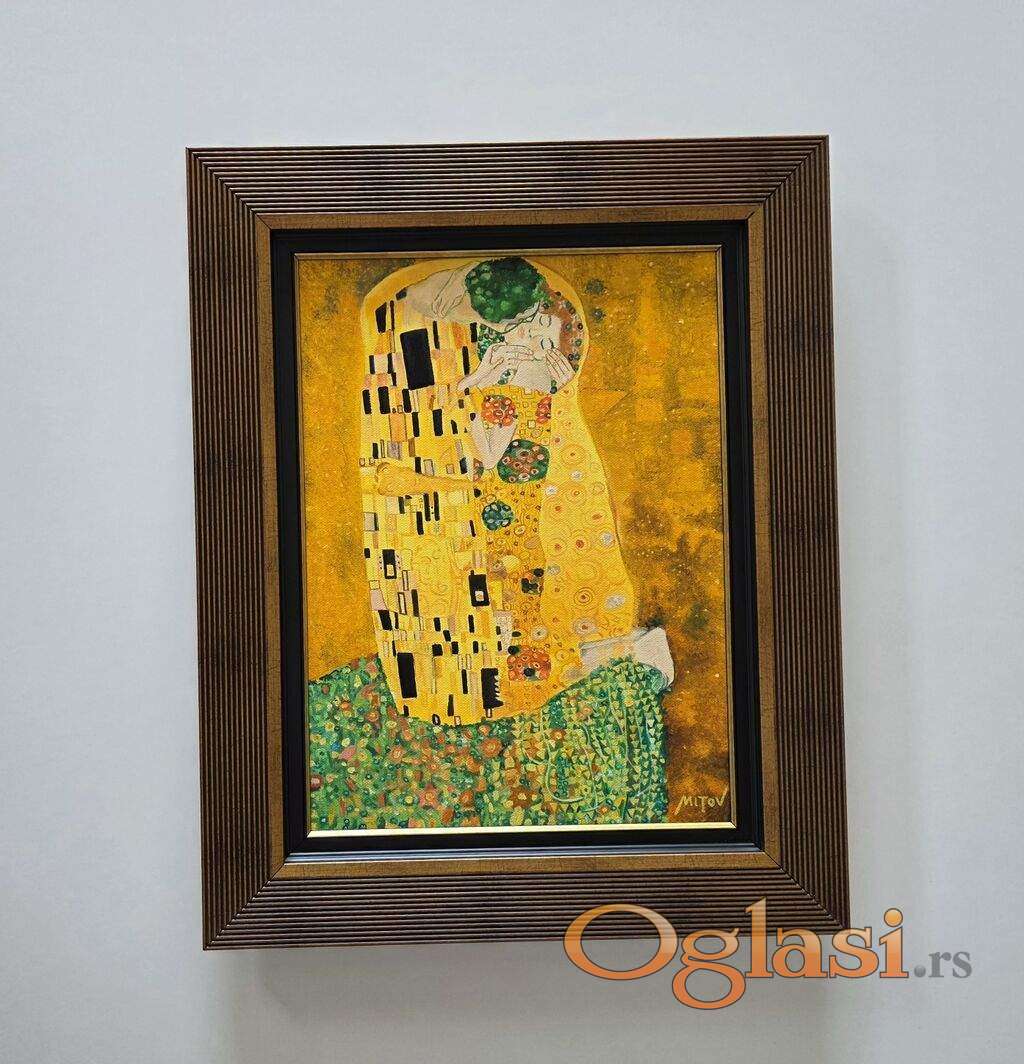 Ulje na platnu Poljubac 3, prelepo umetnicko delo. Slika je uradjena po cuvenoj slici The Kiss, Gustava Klimta. Slika je uramljena u jako lep ram, dimenzije slike sa ramom 54 x 44. Privatna kolekcija.