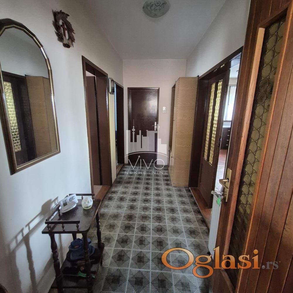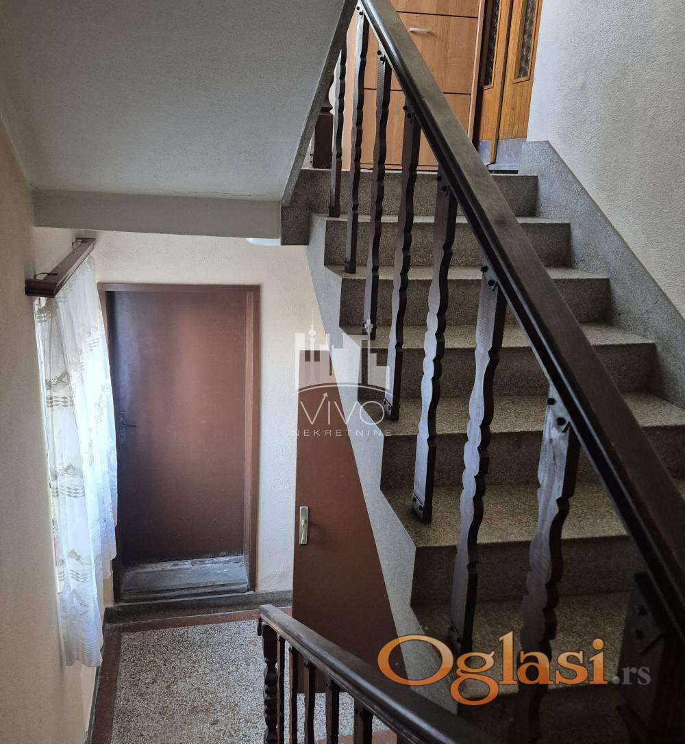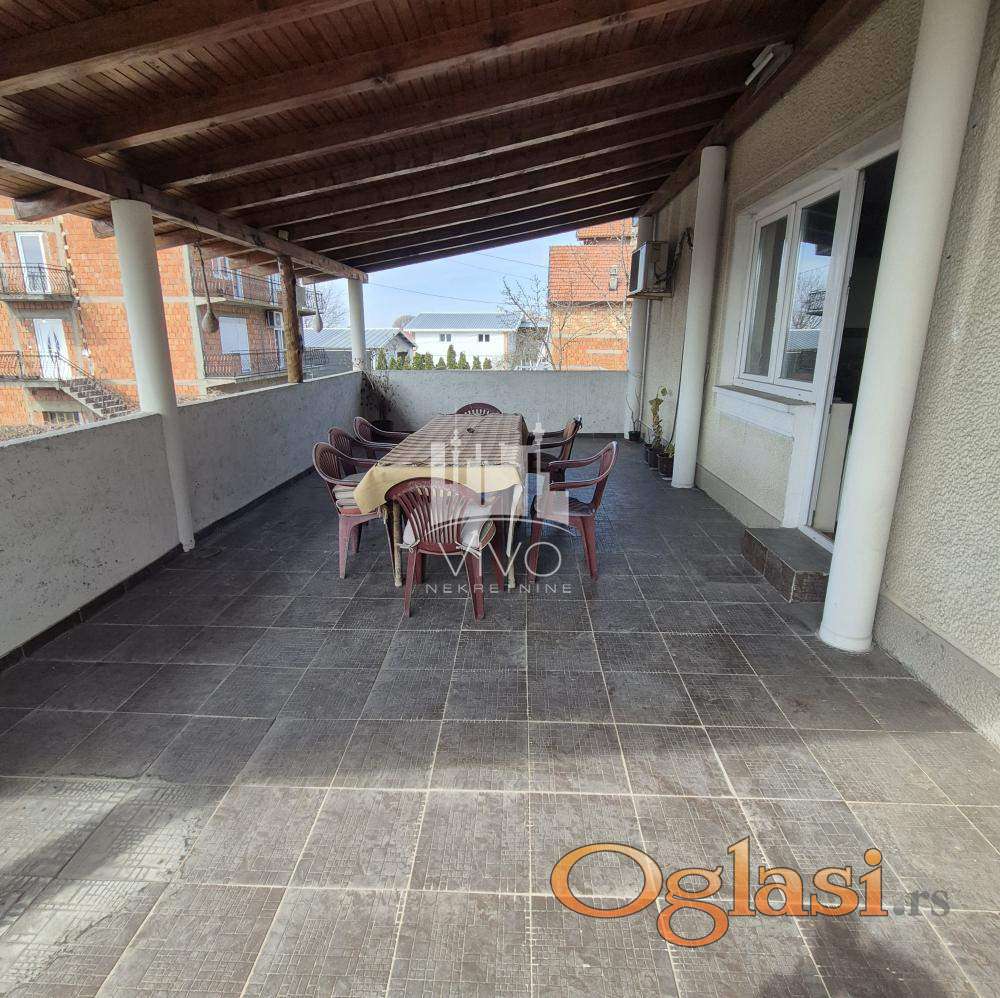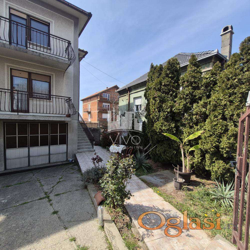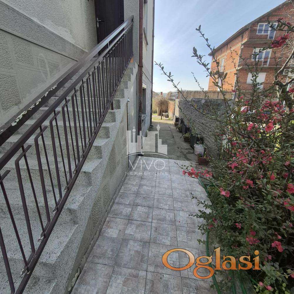 Kuća kvalitetne gradnje, pikovana kamena fasada, izgrađena na 5,5 ari placa, uređeno i ograđeno dvorište. U prizemlju su dve garaže, letnja kuhinja i toalet. Unutrašnjim stepeništem se ulazi na prvi i drugi sprat, na obe etaže je po jedan trosoban stan.