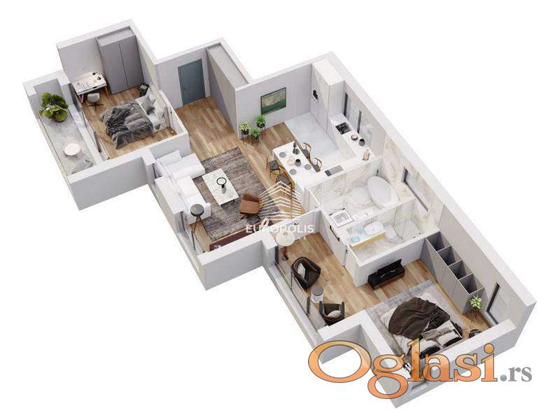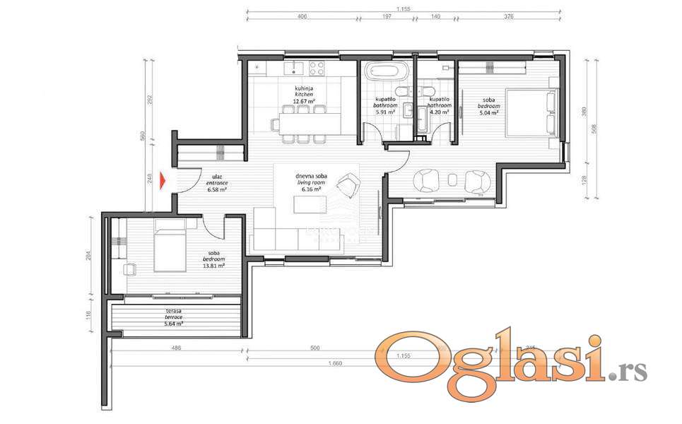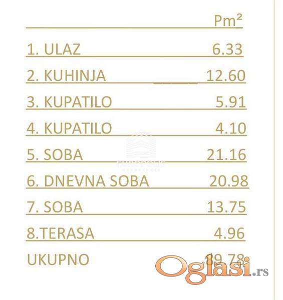 Raspored prostorija: ulaz, kuhinja, dnevna soba, dve sobe, dva kupatila, terasa.