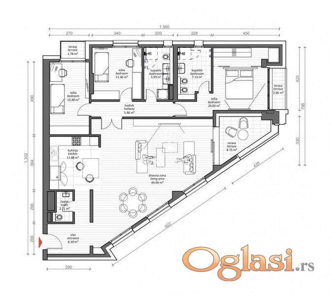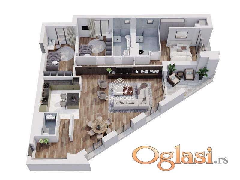 Raspored prostorija: predsoblje, dnevna soba sa trpezarijom, kuhinja, toalet, hodnik, tri sobe, dva kupatila, dve lođe, terasa.