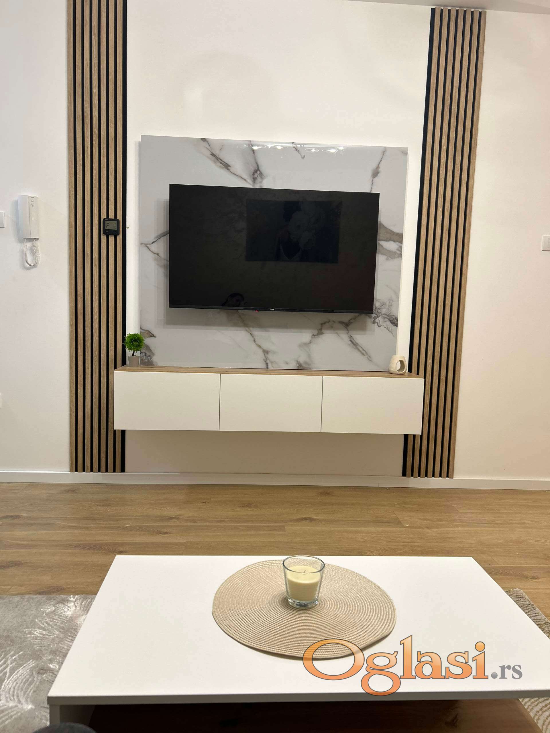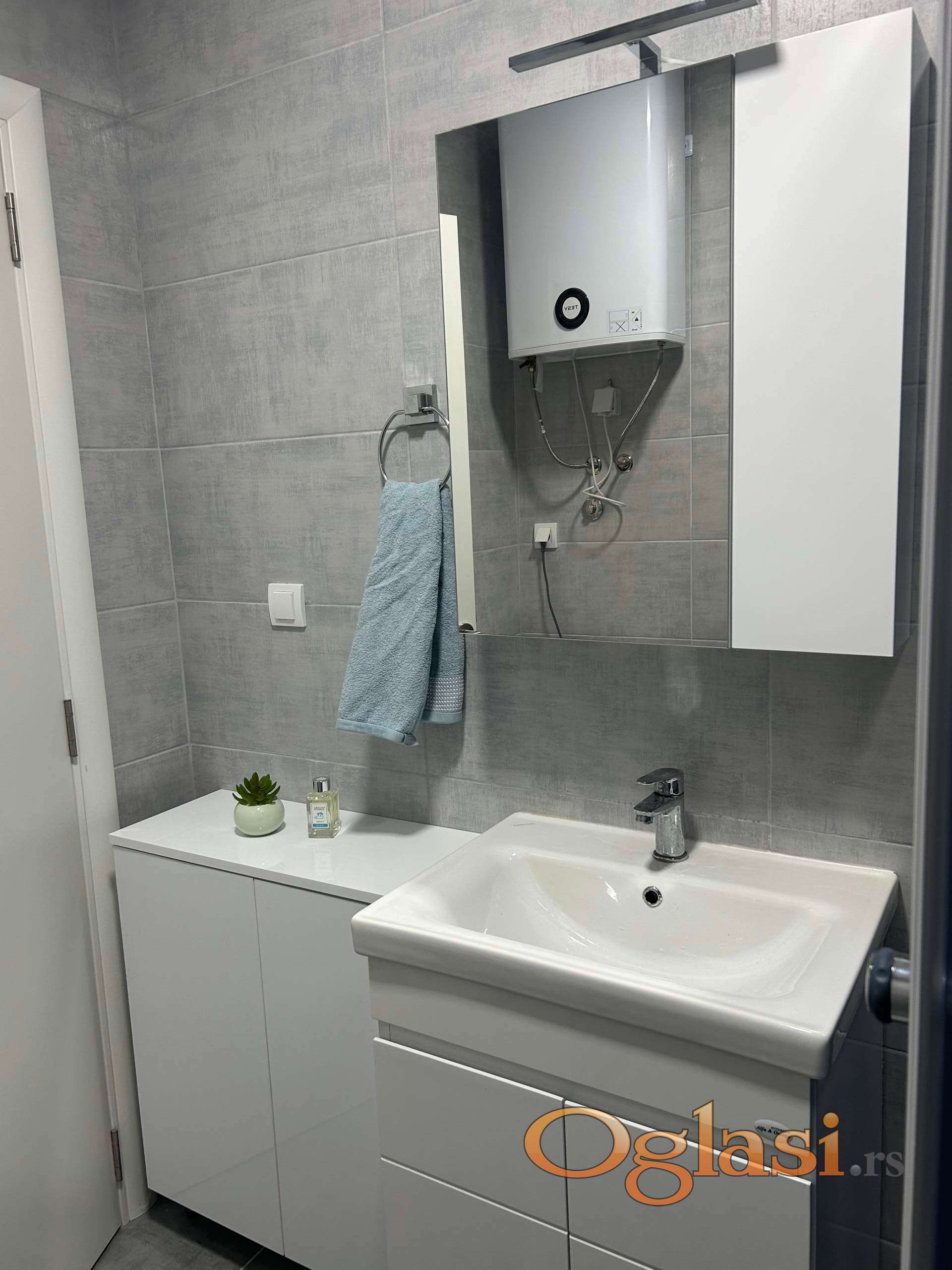 Stan je potpuno namešten i spreman za useljenje — poseduje sve što je potrebno za udoban svakodnevni život (kuhinjski uređaji, veš mašina, nameštaj, itd),takodje poseduje televiziju,internet i podno grejanje.Terasa poseduje stocic i dve stolice. Prostor je funkcionalno organizovan, svetao i prijatan.