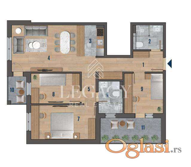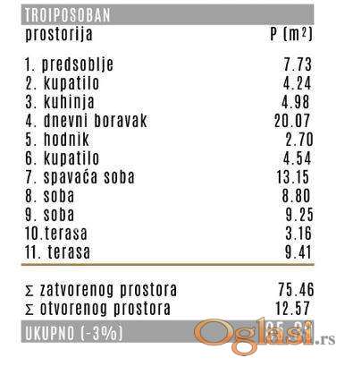 Stan je funkcionalnog rasporeda i sastoji se od ulaznog hodnika, dnevnog boravka sa kuhinjom i trpezarijom otvorenog koncepta, tri spavaće sobe, dva kupatila i dve terase.