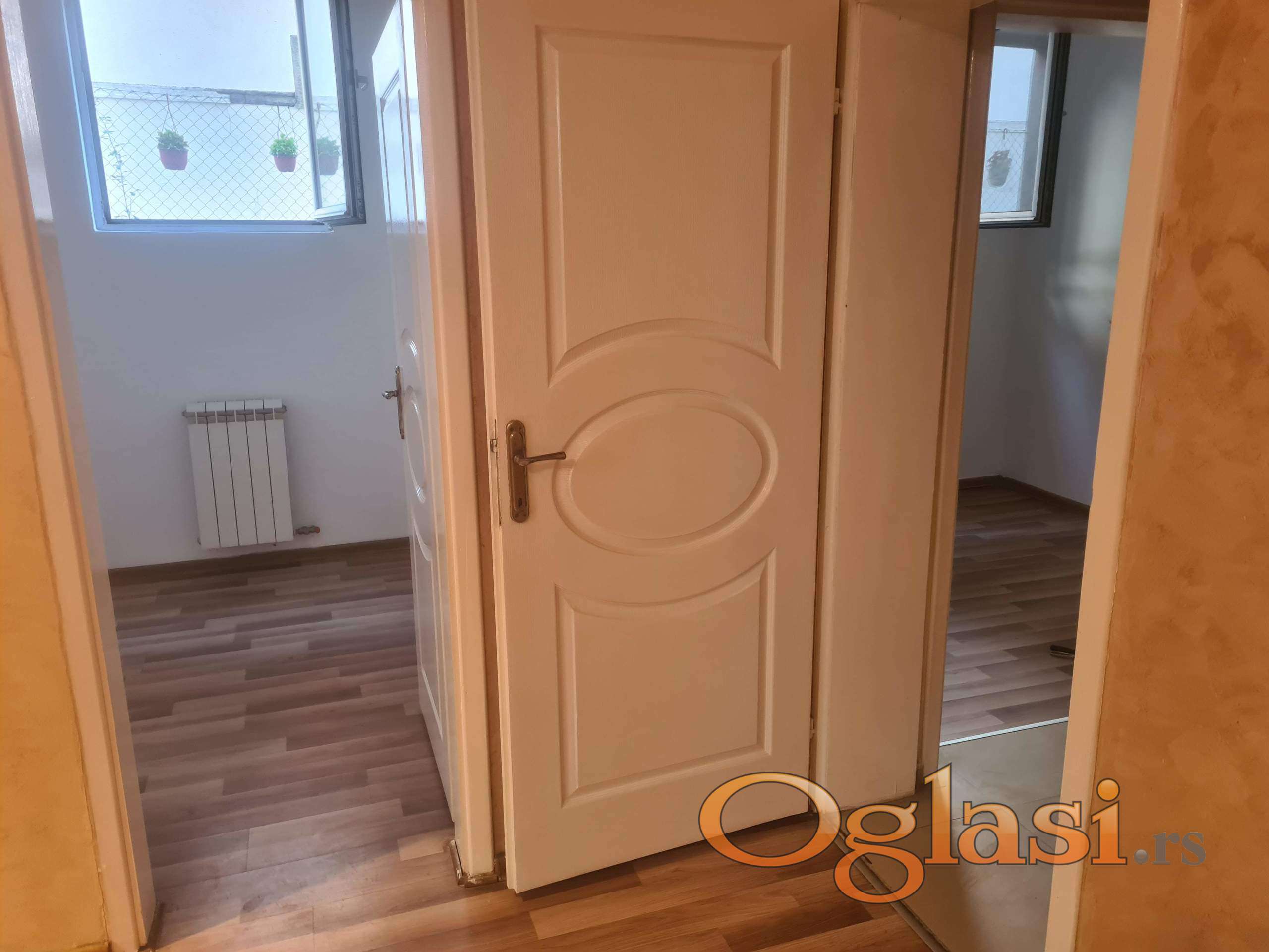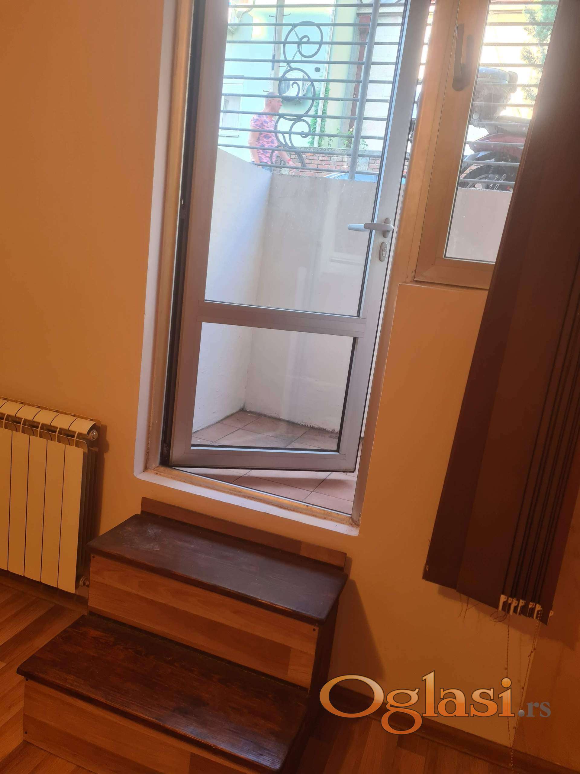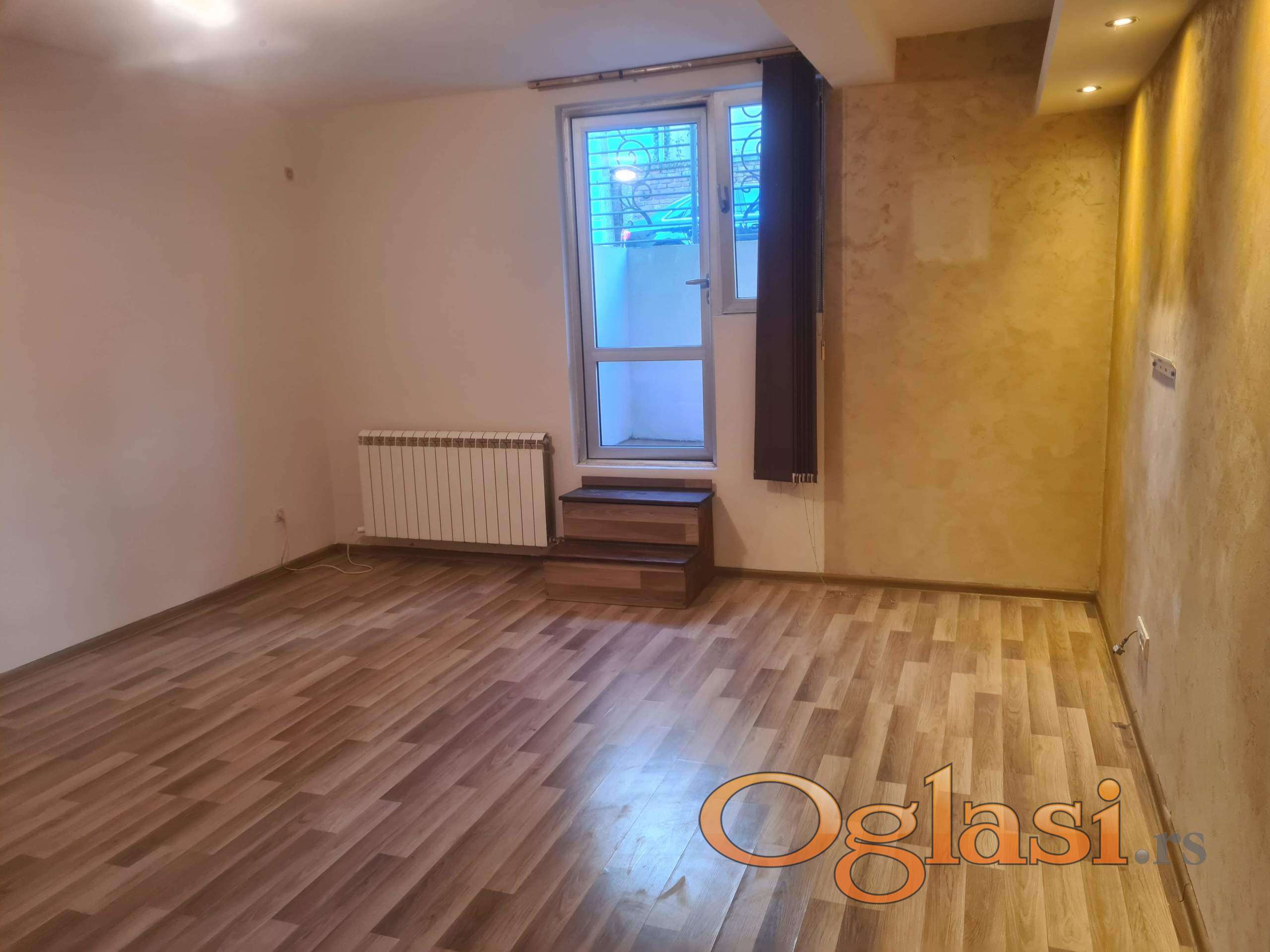 Pogodno za kancelarije. Ima veliki dnevni boravak sa kuhinjom i trepezarijom, dve manje odvojene sobe, hodnik, kupatilo i terasu. Novu veću inverter klimu 18 koja greje i hladi ceo stan. Manji troškovi. Info stan oko 3.00. Suteren je a ispid stana su garaže. Prozori normalni. Poslednji stanari su bili advokati. Tj. Advokatska kancelarija. Lokacija top.