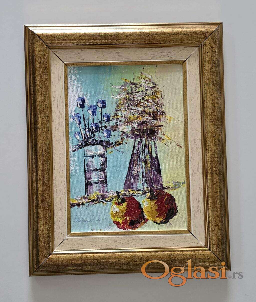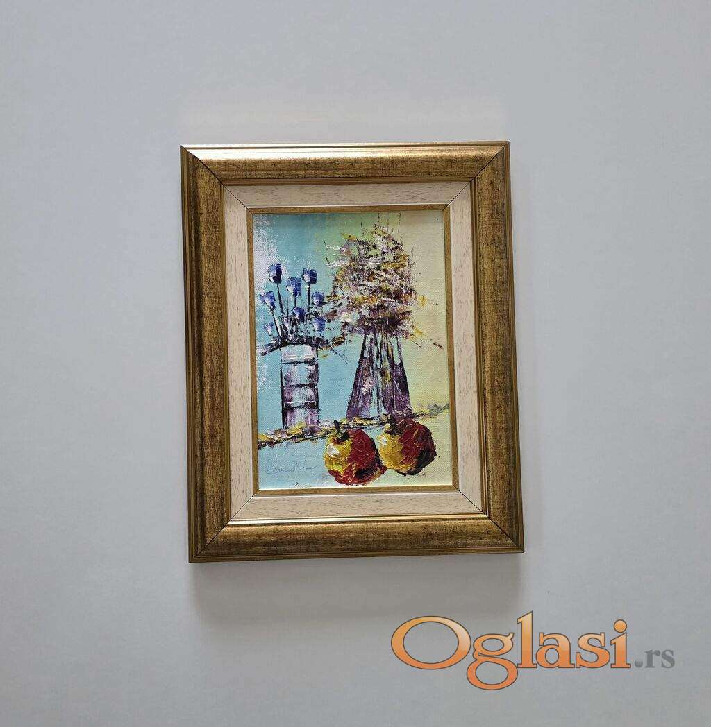 Ulje na platnu Dve vaze i jabuke, prelepo umetnicko delo. Slika je uramljena u jako lep ram, dimenzije slike sa ramom 38 x 32. Privatna kolekcija.