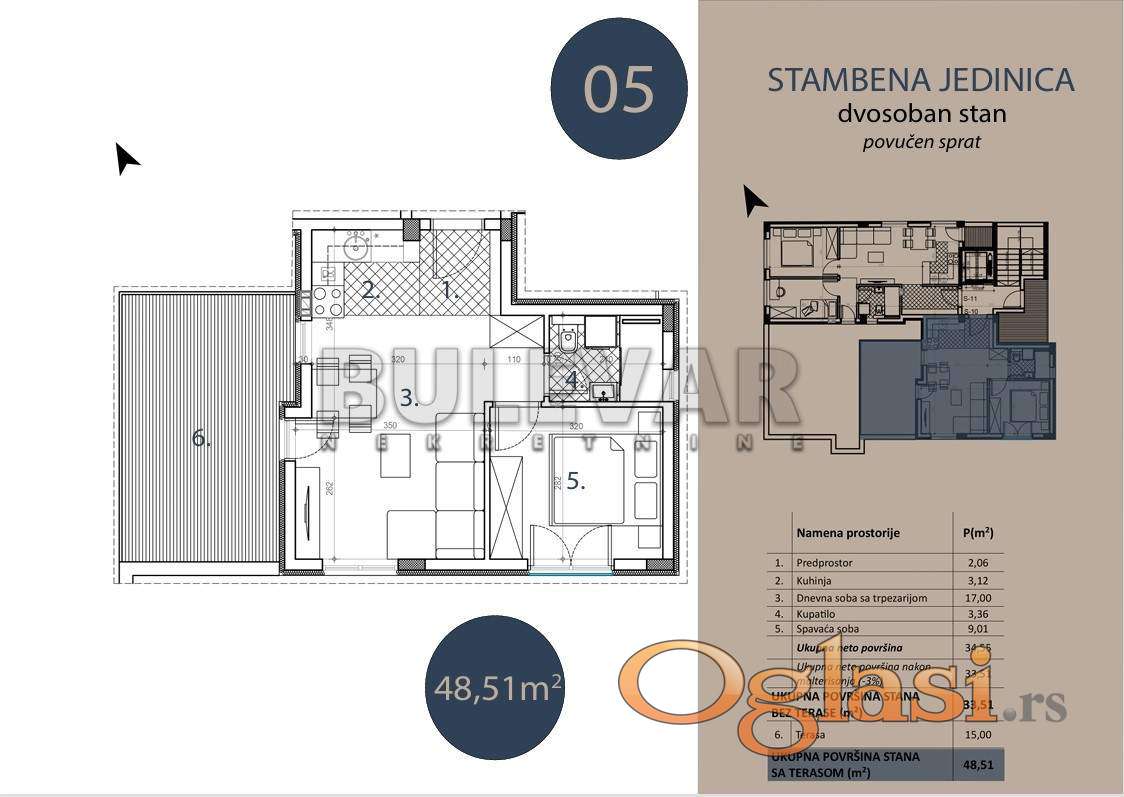 Stan je površine 48.51 m² od cega je 33.51 kvadratura stana + 15m2 terase i sastoji se od: dnevne sobe sa trpezarijom, kuhinjom, spavaće sobe, kupatila i terase.