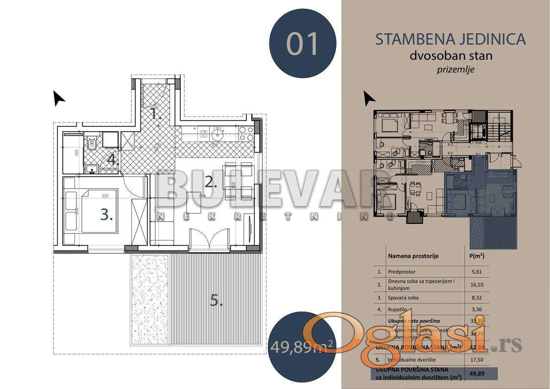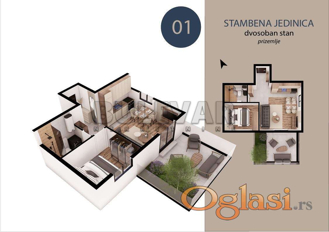 Na prodaju dvosoban stan u prizemlju kvalitetne novogradnje (Pr + 3), na mirnoj i atraktivnoj lokaciji u naselju Trošarina. Stan se nalazi u lepo uređenom i tihom okruženju, idealnom za porodičan život, a u neposrednoj blizini se nalaze osnovna škola, pijaca, pošta, crkva, Klinički centar i Stop Shop. Stan je površine 47.39 m² od cega je 32.39 kvadratura stana + 17.5m2 terase (dvorišta) uz stan i sastoji se od: dnevne sobe sa trpezarijom i kuhinjom, spavaće sobe, kupatila. Sve stambene jedinice su izgrađene od visko kvalitetnih materijala: PVC stolarije (antracit spolja / bela iznutra), termo fasadom 10 cm, hrastov tarket prve klase, kvalitetne granitne pločice za kupatilo i kuhinju, kupatilo opremljeno (Peštan sanitarijom, ugradnim ormarićem, ogledalom sa LED rasvetom), Rosan baterijama za lavabo i tuš kabinu. Grejanje i hlađenje je inverter klima uređajem i norveškim radijatorima. Stan je idealan kako za život, tako i kao investicija za izdavanje zbog odlične lokacije i funkcionalnosti. Za kupce prvog stana postoji mogućnost povraćaja PDV-a. Zavrsetak radova predviđen je za jul 2027. godine. Ovo je samo deo naše ponude, za više informacija stojimo Vam na raspolaganju.