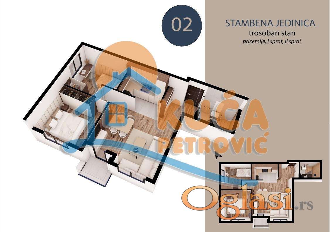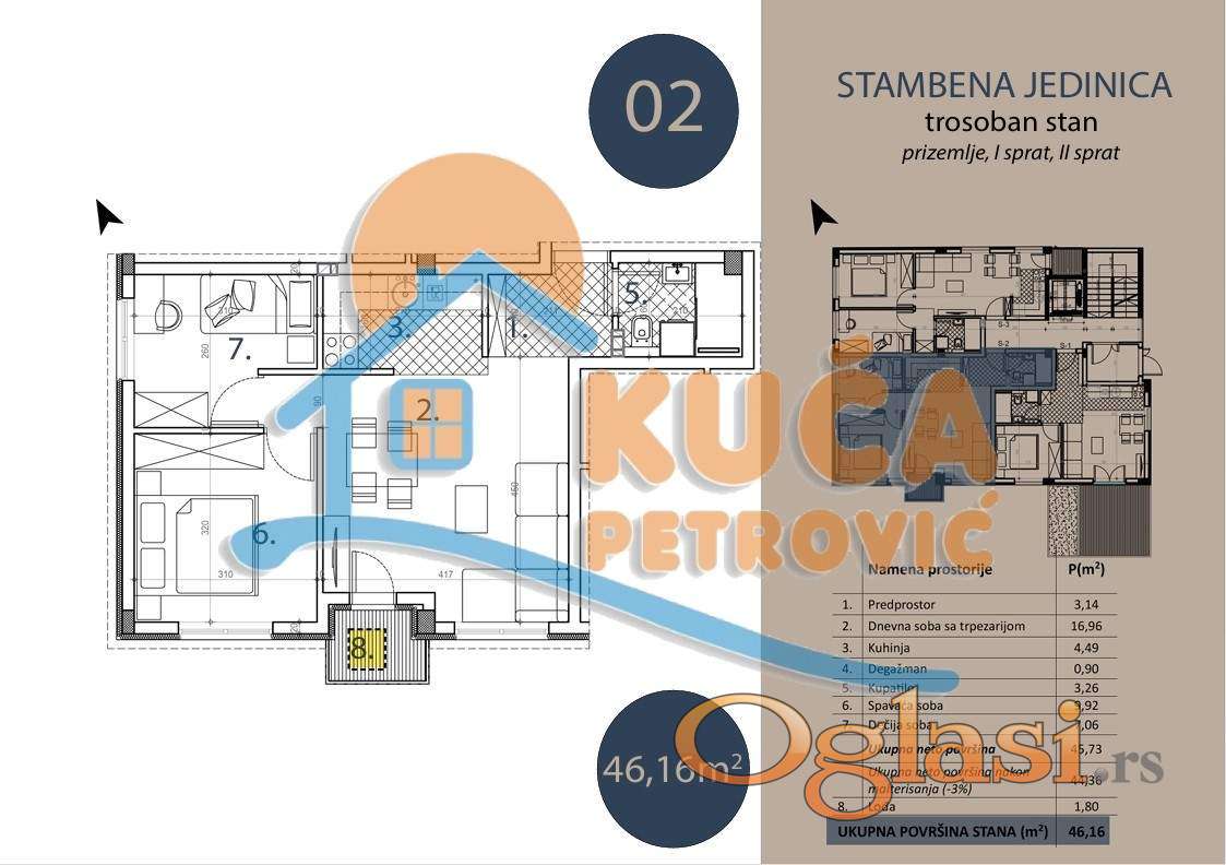 Na prodaju stan površine 46.16 m² u prizemlju kvalitetne novogradnje (Pr + 3), na mirnoj i atraktivnoj lokaciji u naselju Trošarina. Stan se nalazi u lepo uređenom i tihom okruženju, idealnom za porodičan život, a u neposrednoj blizini se nalaze osnovna škola, pijaca, pošta, crkva, Klinički centar i Stop Shop. Trosoban stan je površine 41.88 m², u prizemlju, sledeće strukture: dnevna soba sa trpezarijom, kuhinja, spavaća soba, dečija spavaca soba, kupatilo, lođa. Sve stambene jedinice su moderno opremljene i izgradjene od visoko kvalitetnih materijala: PVC stolarije (antracit spolja / bela iznutra), termo fasade 10 cm, hrastov tarket prve klase, kvalitetne granitne pločice, kupatilo opremljeno (Peštan sanitarijom, ugradnim ormarićem, ogledalom sa LED rasvetom), Rosan baterije za lavabo i tuš kabinu, grejanje i hlađenje je inverter klima uređajem i norveškim radijatorima. Stan je idealan kako za život, tako i kao investicija za izdavanje zbog odlične lokacije i funkcionalnosti. Mogućnost povraćaja PDV-a za kupce prvog stana. Završetak radova je predviđen jula 2027. godine. Ovo je samo deo naše ponude, za više informacija stojimo Vam na raspolaganju.