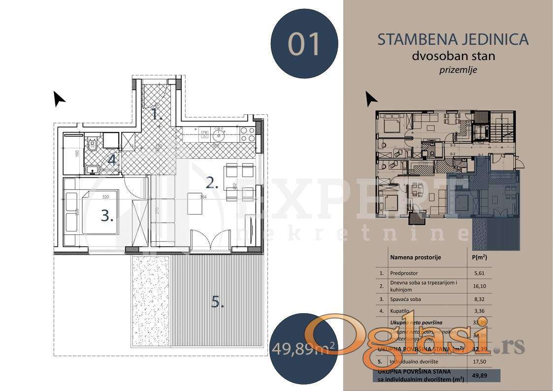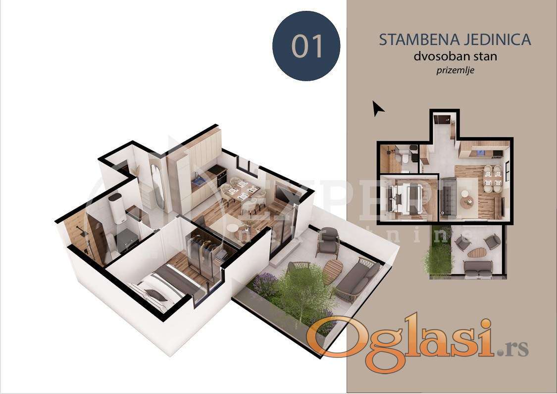 Na prodaju dvosoban stan u prizemlju kvalitetne novogradnje (Pr + 3), na mirnoj i atraktivnoj lokaciji u naselju Trošarina. Stan se nalazi u lepo uređenom i tihom okruženju, idealnom za porodičan život, a u neposrednoj blizini se nalaze osnovna škola, pijaca, pošta, crkva, Klinički centar i Stop Shop. Stan je površine 47.39 m² od cega je 32.39 kvadratura stana + 17.5m2 terase (dvorišta) uz stan i sastoji se od: dnevne sobe sa trpezarijom i kuhinjom, spavaće sobe, kupatila. Sve stambene jedinice su izgrađene od visko kvalitetnih materijala: PVC stolarije (antracit spolja / bela iznutra), termo fasadom 10 cm, hrastov tarket prve klase, kvalitetne granitne pločice za kupatilo i kuhinju, kupatilo opremljeno (Peštan sanitarijom, ugradnim ormarićem, ogledalom sa LED rasvetom), Rosan baterijama za lavabo i tuš kabinu. Grejanje i hlađenje je inverter klima uređajem i norveškim radijatorima. Stan je idealan kako za život, tako i kao investicija za izdavanje zbog odlične lokacije i funkcionalnosti. Za kupce prvog stana postoji mogućnost povraćaja PDV-a. Zavrsetak radova predviđen je za jul 2027. godine. Ovo je samo deo naše ponude, za više informacija stojimo Vam na raspolaganju.