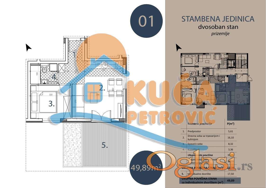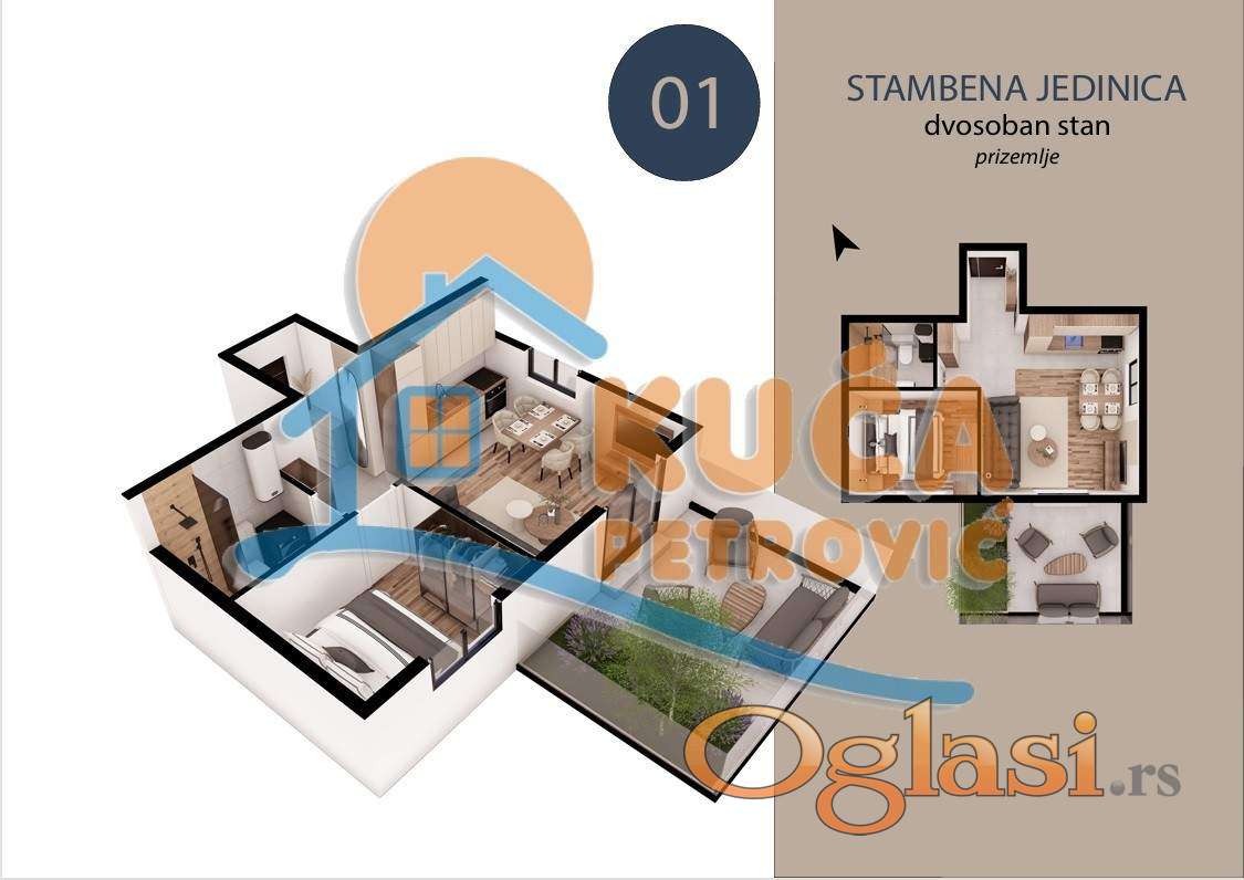 Na prodaju dvosoban stan u prizemlju kvalitetne novogradnje (Pr + 3), na mirnoj i atraktivnoj lokaciji u naselju Trošarina. Stan se nalazi u lepo uređenom i tihom okruženju, idealnom za porodičan život, a u neposrednoj blizini se nalaze osnovna škola, pijaca, pošta, crkva, Klinički centar i Stop Shop. Stan je površine 47.39 m² od cega je 32.39 kvadratura stana + 17.5m2 terase (dvorišta) uz stan i sastoji se od: dnevne sobe sa trpezarijom i kuhinjom, spavaće sobe, kupatila. Sve stambene jedinice su izgrađene od visko kvalitetnih materijala: PVC stolarije (antracit spolja / bela iznutra), termo fasadom 10 cm, hrastov tarket prve klase, kvalitetne granitne pločice za kupatilo i kuhinju, kupatilo opremljeno (Peštan sanitarijom, ugradnim ormarićem, ogledalom sa LED rasvetom), Rosan baterijama za lavabo i tuš kabinu. Grejanje i hlađenje je inverter klima uređajem i norveškim radijatorima. Stan je idealan kako za život, tako i kao investicija za izdavanje zbog odlične lokacije i funkcionalnosti. Za kupce prvog stana postoji mogućnost povraćaja PDV-a. Zavrsetak radova predviđen je za jul 2027. godine. Ovo je samo deo naše ponude, za više informacija stojimo Vam na raspolaganju.