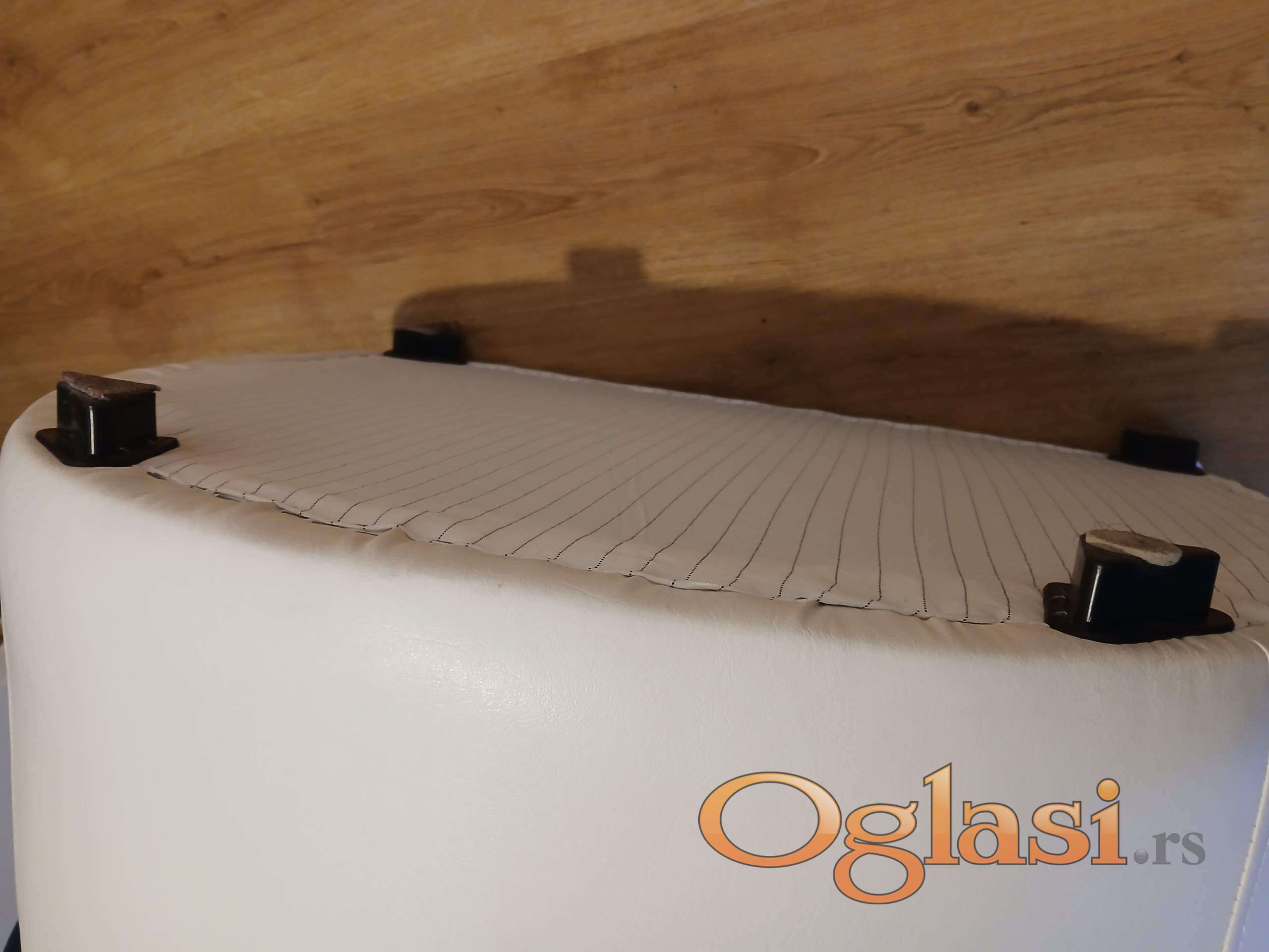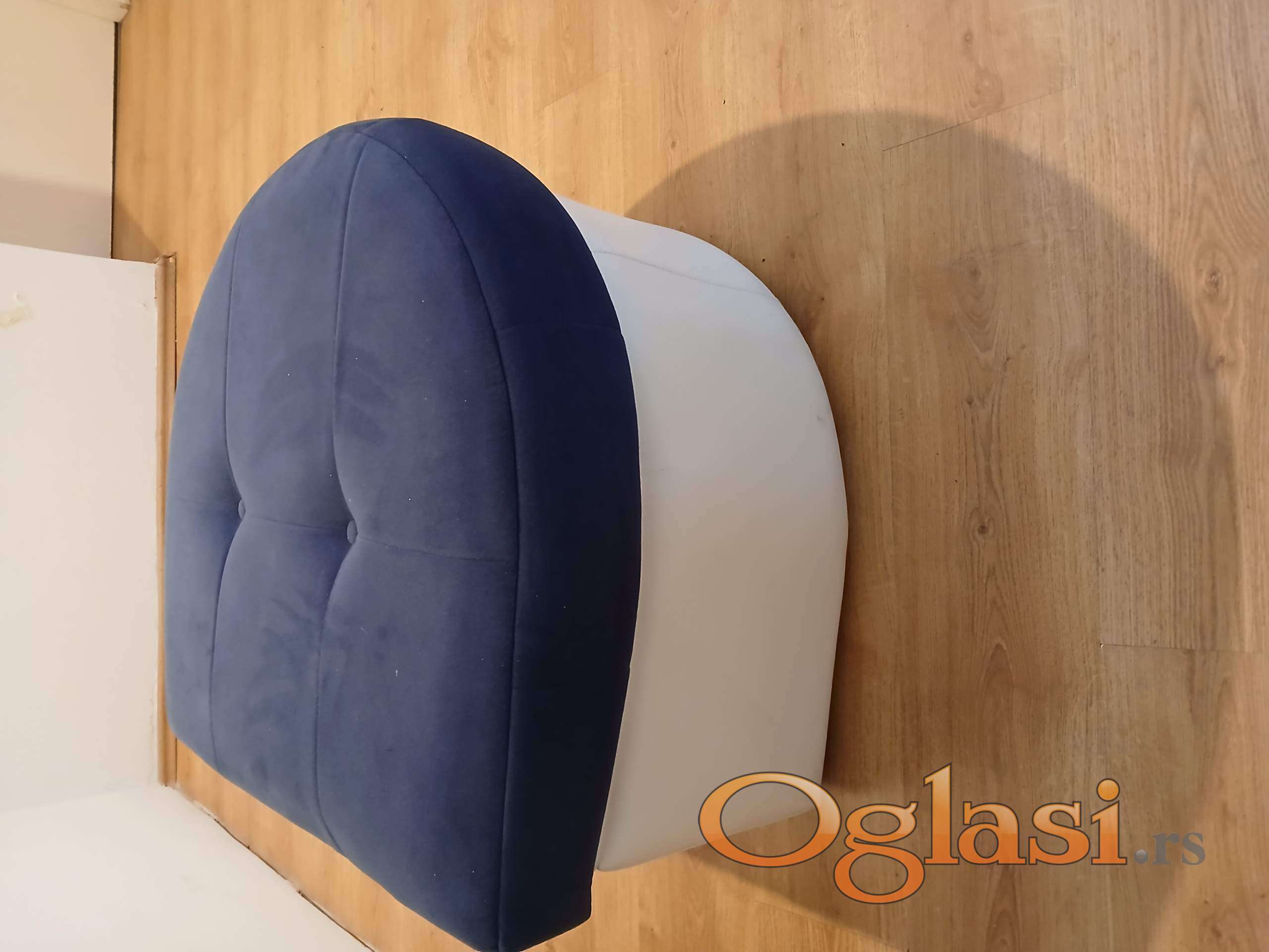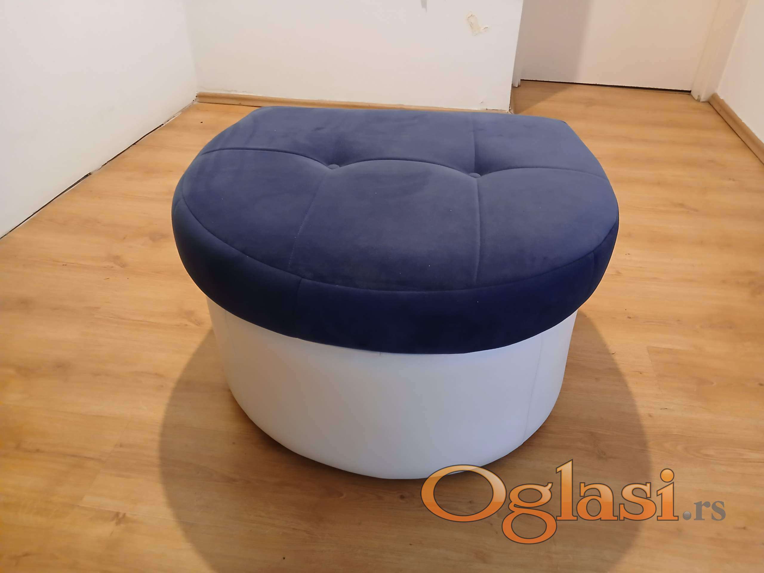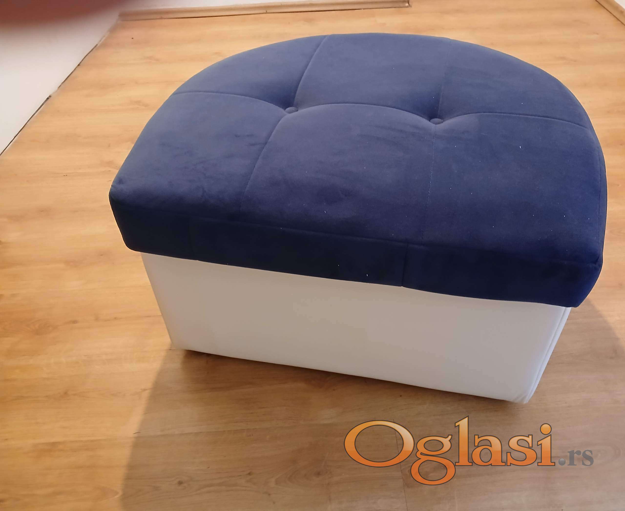 Veoma lep, polukruzni tabure. Ocuvan, bez ostecenja. Gornji deo je plavi stof, donji je umetna koza. Dimenzije: sirina, duzina 70cm*77cm, visina 46cm.