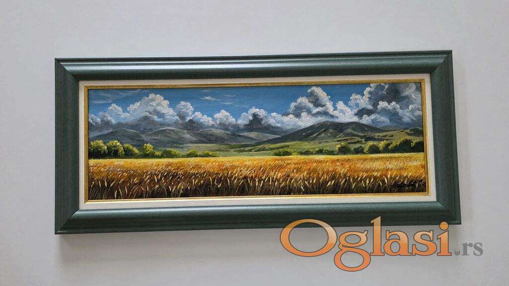 Ulje na platnu Zetva pod planinom, prelepo umetnicko delo. Slika je uramljena u jako lep, dimenzije slike sa ramom 72 x 32. Privatna kolekcija.