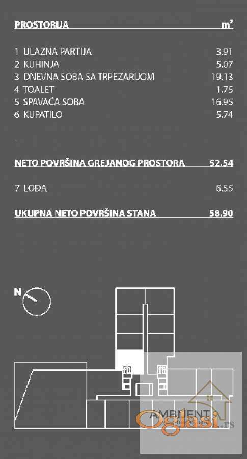 Dvosoban stan severozapadno orijentisan površine 58.9 m2 u savremenoj novogradnji, sa rokom završetka izgradnje planiranim za decembar 2026. godine.