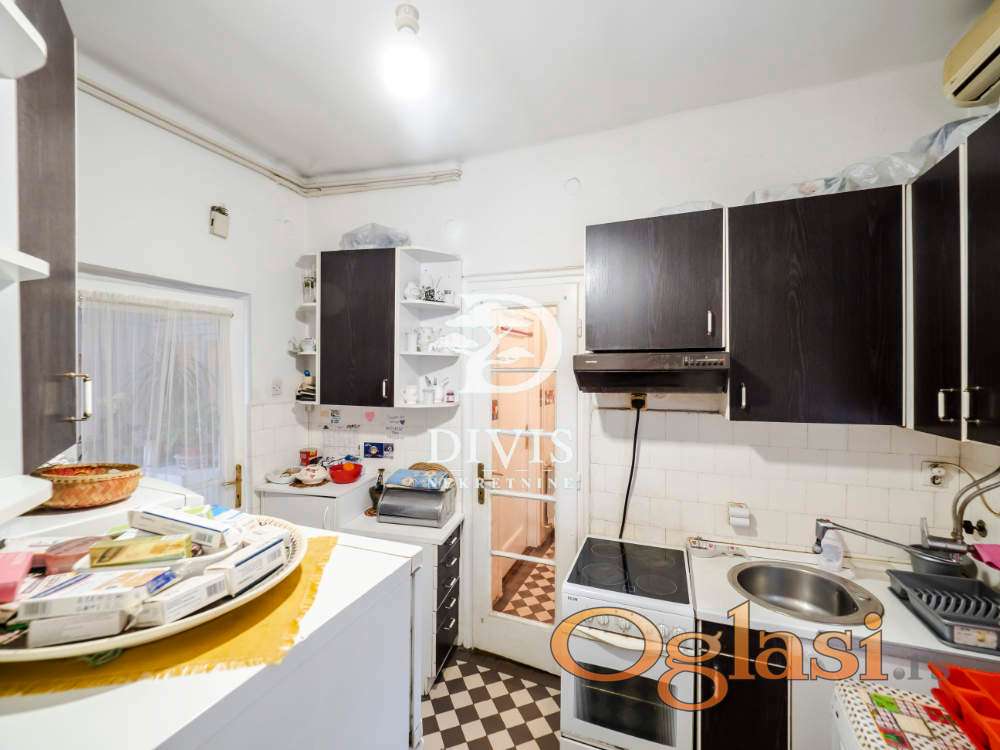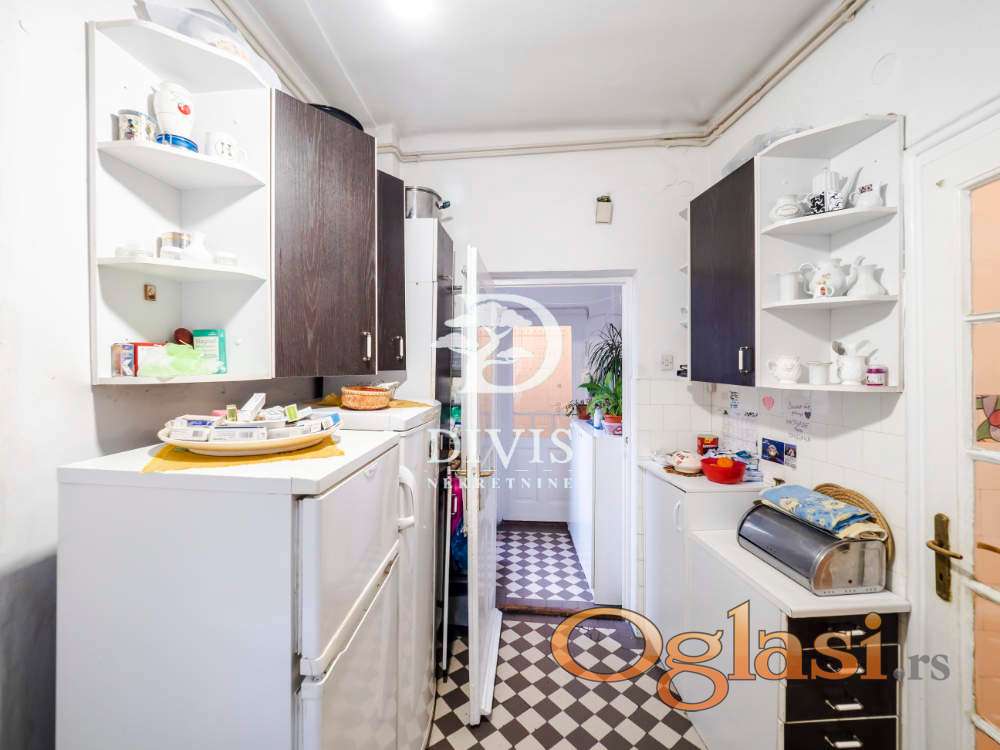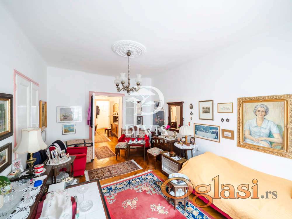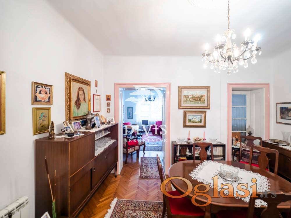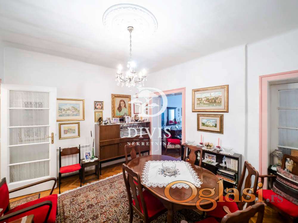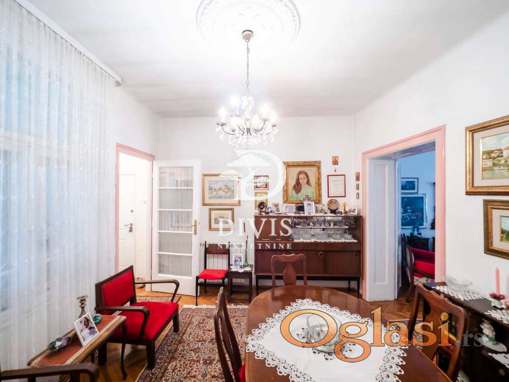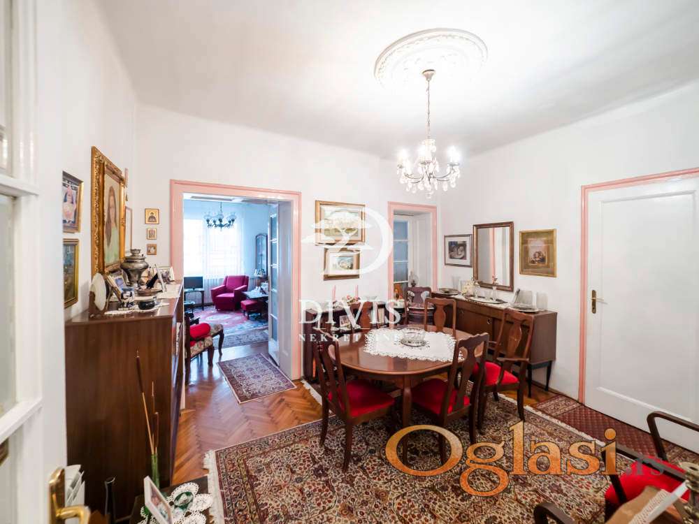 Ovu nekretninu odlikuju visoki plafoni od 3.2 m, dvostrana orijentacija i obilje prirodne svetlosti tokom celog dana. Po strukturi je troiposoban i funkcionalno raspoređen: ulazni hodnik vodi u prostrani salon koji objedinjuje dnevni boravak i trpezariju, odvojenu kuhinju sa ostavom, dve velike spavaće sobe, jednu manju sobu, lođu, kao i kupatilo sa dva ulaza i dodatni toalet.