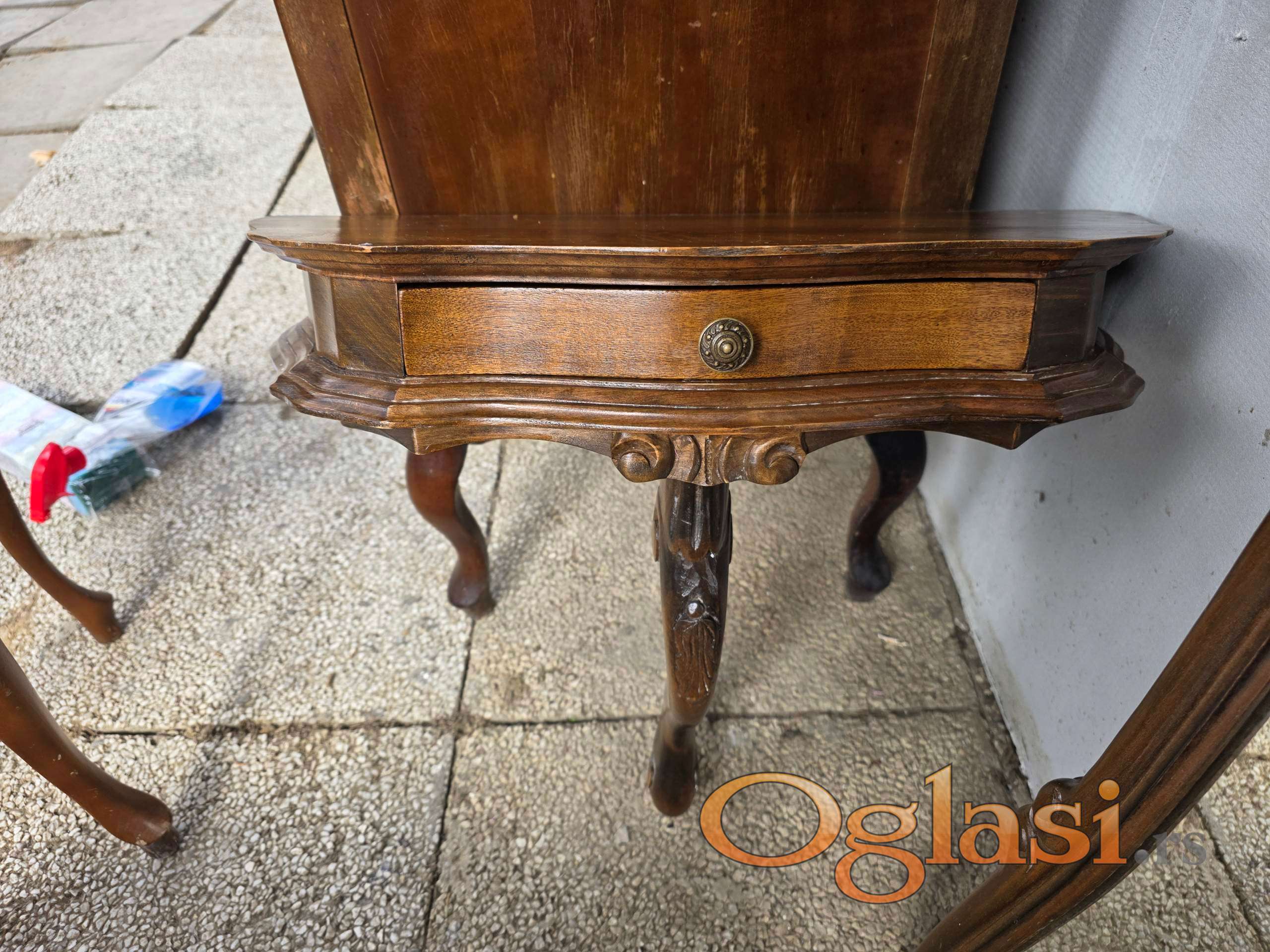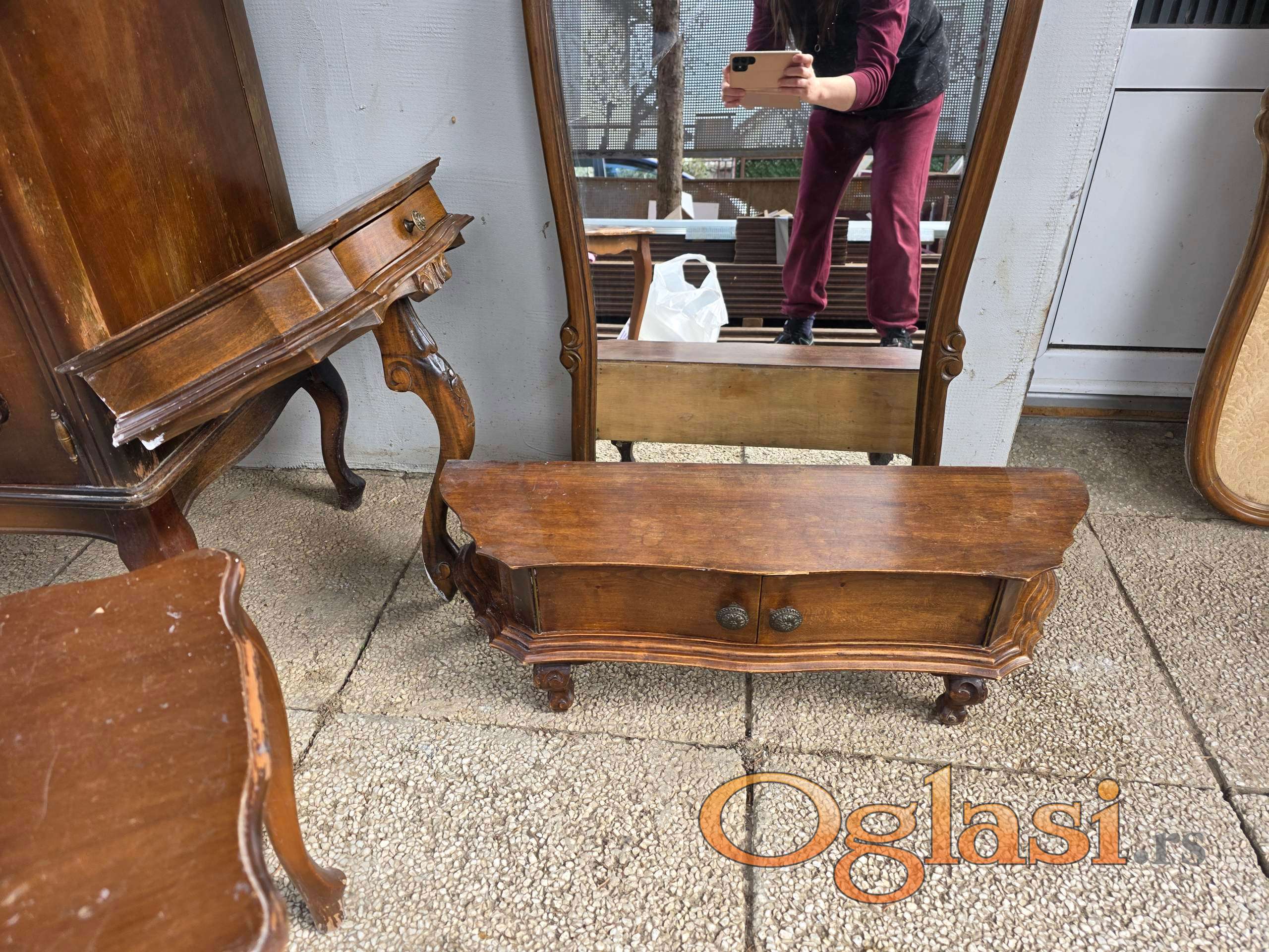 Prodajem kompletan stilski namestaj za predsoblje koji se sastoji od ogledala, civiluka, stola ispod ogledala i malog cipelara koji ide ispod civiluka i komodu. Ko kupi i predsoblje i komodu dobija jedan mali stocic gratis!