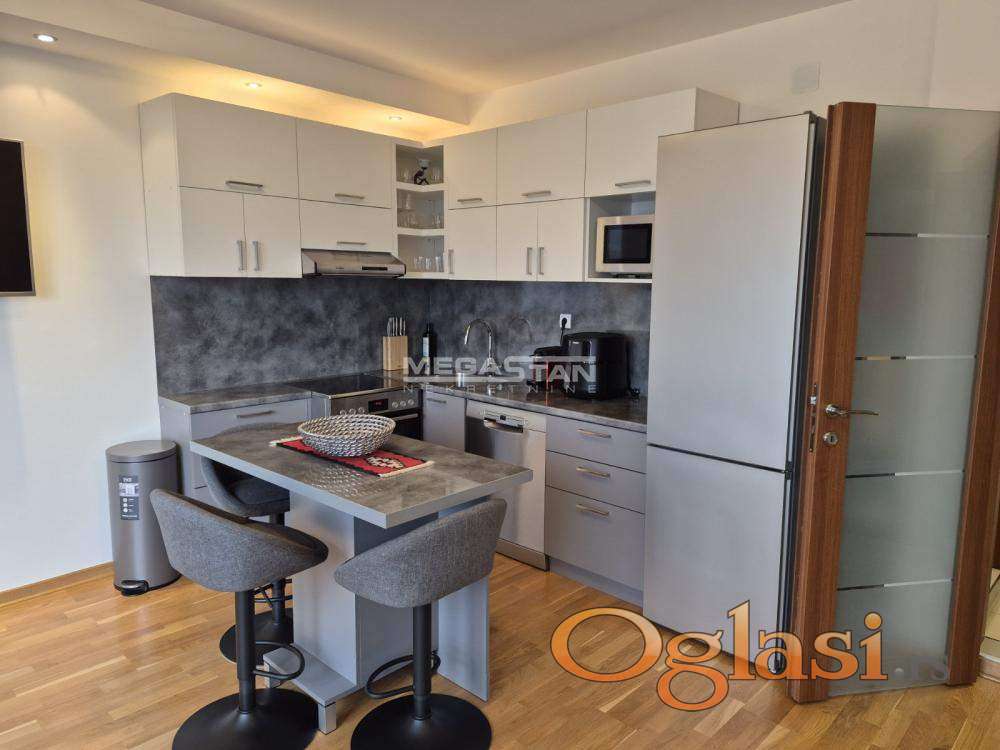 Kuhinja, plakari i kupatilo rađeni su po meri, sa posebnom pažnjom na kvalitet materijala i funkcionalnost prostora, dok su u stanu ugrađeni premium uređaji bele tehnike renomiranih brendova Bosch i Miele.