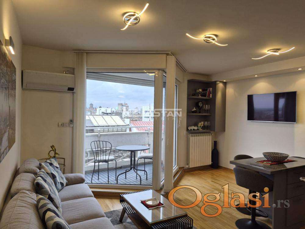 For sale is a completely renovated luxury apartment with one of the most beautiful views in Belgrade, situated right on Republic Square and in the immediate vicinity of Knez Mihailova Street, on Kolarčeva Street. The apartment is registered at 56 m², free of encumbrances and annotations, while the actual area is approximately 60 m². It is located on the 9th floor out of 10, in a building with an elevator, and offers an unobstructed panoramic view of the city, including the Church of Saint Mark, the National Assembly, Terazije, the Danube, and Republic Square. It is exceptionally bright throughout the day thanks to the high floor level and open views.
