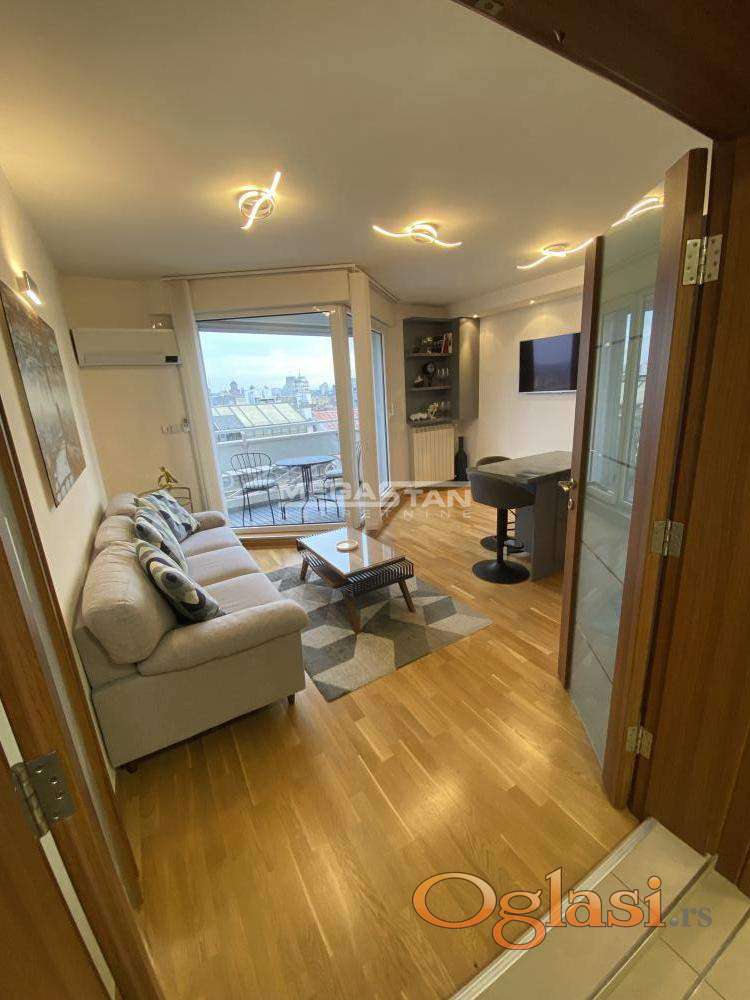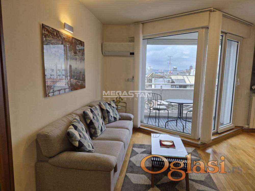 Nalazi se na 9. spratu od ukupno 10, u zgradi sa liftom i pruža neometan panoramski pogled na grad, uključujući crkvu Svetog Marka, Narodnu skupštinu, Terazije, Dunav i Trg Republike.