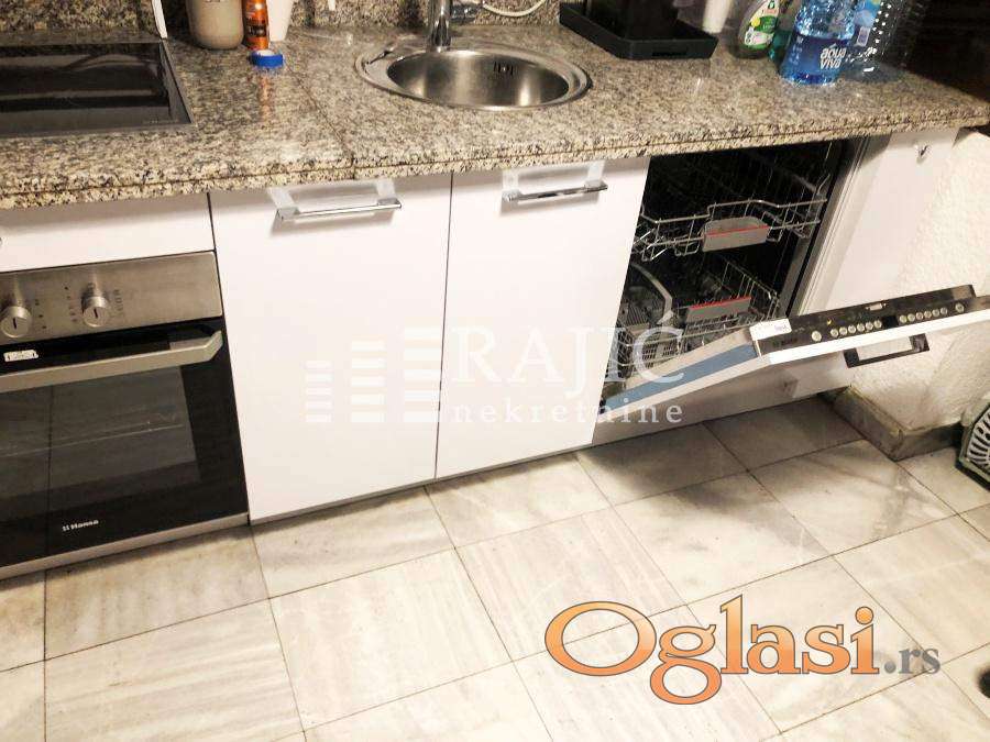 Prva etaža - prostran dnevni boravak iz kog se izlazi u dvorište (lepa bašta zaštićena od pogleda, jedan deo natkriven i zaštićen od padavina), velika kuhinja (kvalitetna bela tehnika - veliki frižider sa zamrzivačem, sudo mašina...), mala spavaća soba, kupatilo.