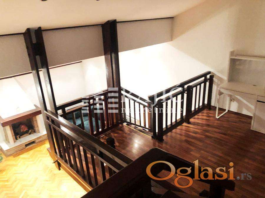 Prva etaža - prostran dnevni boravak iz kog se izlazi u dvorište (lepa bašta zaštićena od pogleda, jedan deo natkriven i zaštićen od padavina), velika kuhinja (kvalitetna bela tehnika - veliki frižider sa zamrzivačem, sudo mašina...), mala spavaća soba, kupatilo.