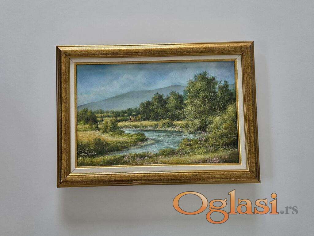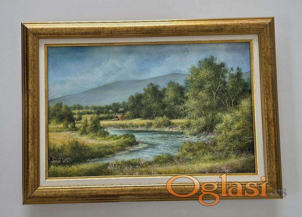Ulje na platnu Reka kroz dolinu, prelepo umetnicko delo. Slika je uramljena u jako lep ram, dimenzije slike sa ramom 56 x 39. Privatna kolekcija.