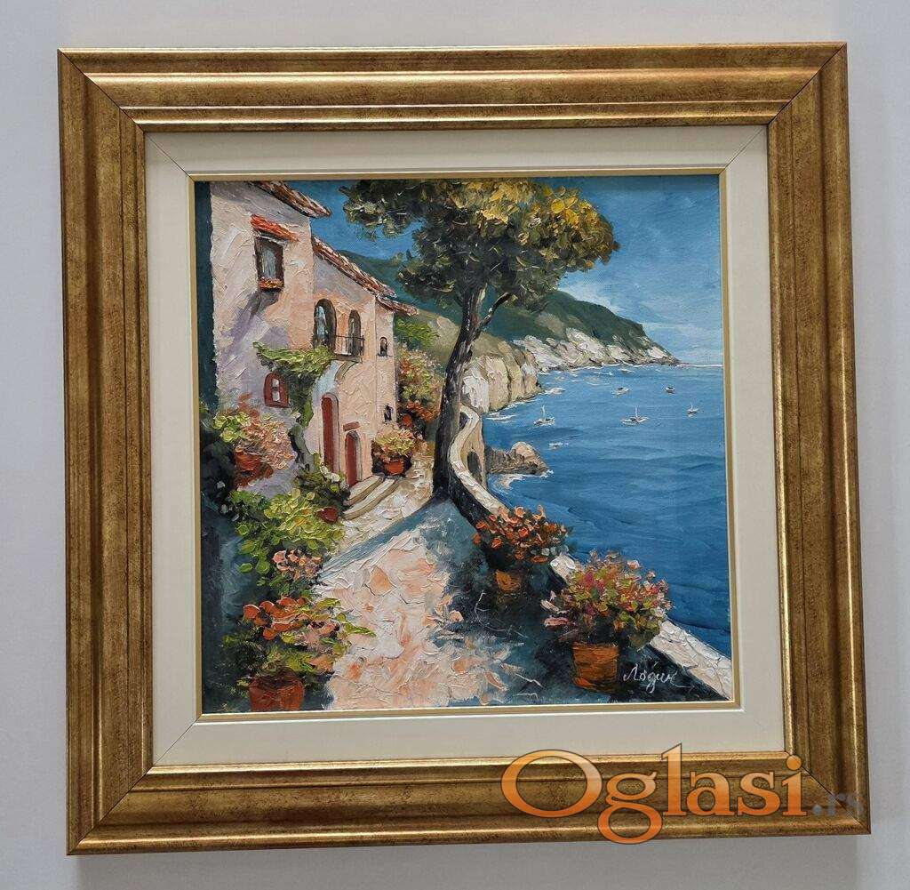 Ulje na platnu Obala iz snova, prelepo umetnicko delo. Slika je uramljena u jako lep ram, dimenzije slike sa ramom 59 x 59. Privatna kolekcija.