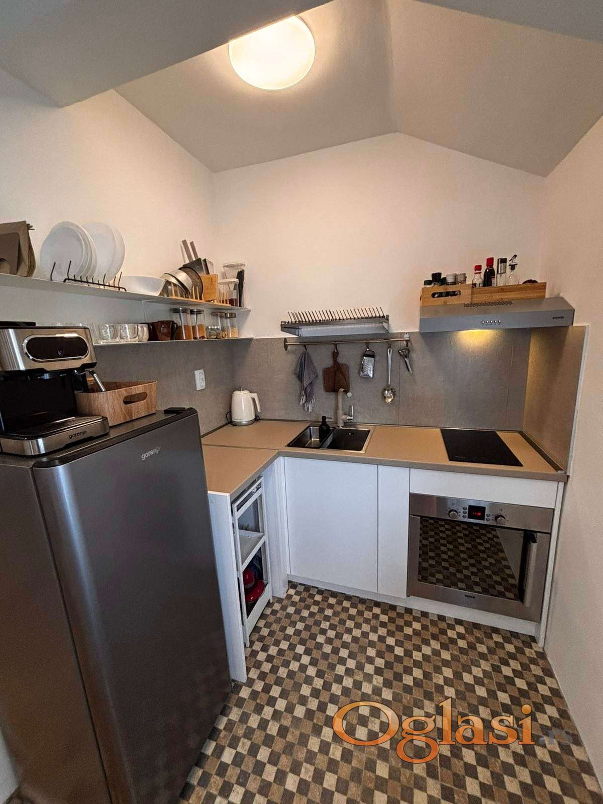 Stan se prostire na dve etaže, u donjem delu se nalaze dnevna soba sa kuhinjom i trpezarijskim delom, spavaća soba i kupatilo, a na gornjoj etaži smeštena je dodatna spavaća soba.