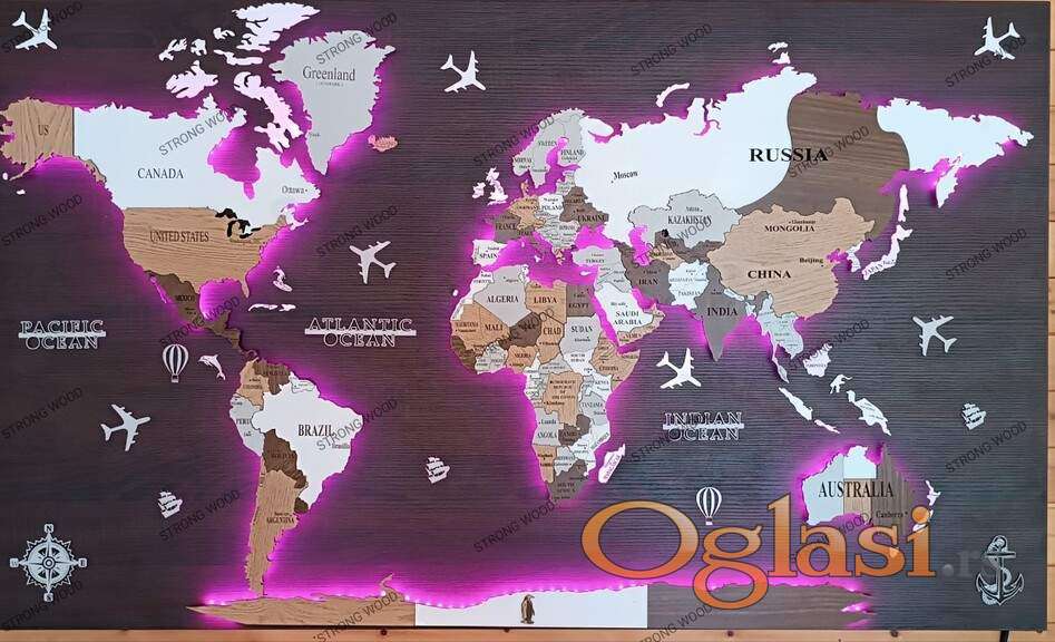 Iza kontinenata postavljena je RGB traka kojom se upravlja preko Tuya kontrolera pomoću aplikacije Smart Life na vašem pametnom telefonu. Ovo vam omogućava da menjate boje,tajmer, prilagodite jačinu svetlosti i još mnogo toga. . Dostupne u različitim dimenzijama: 140×90, 250×150 i više