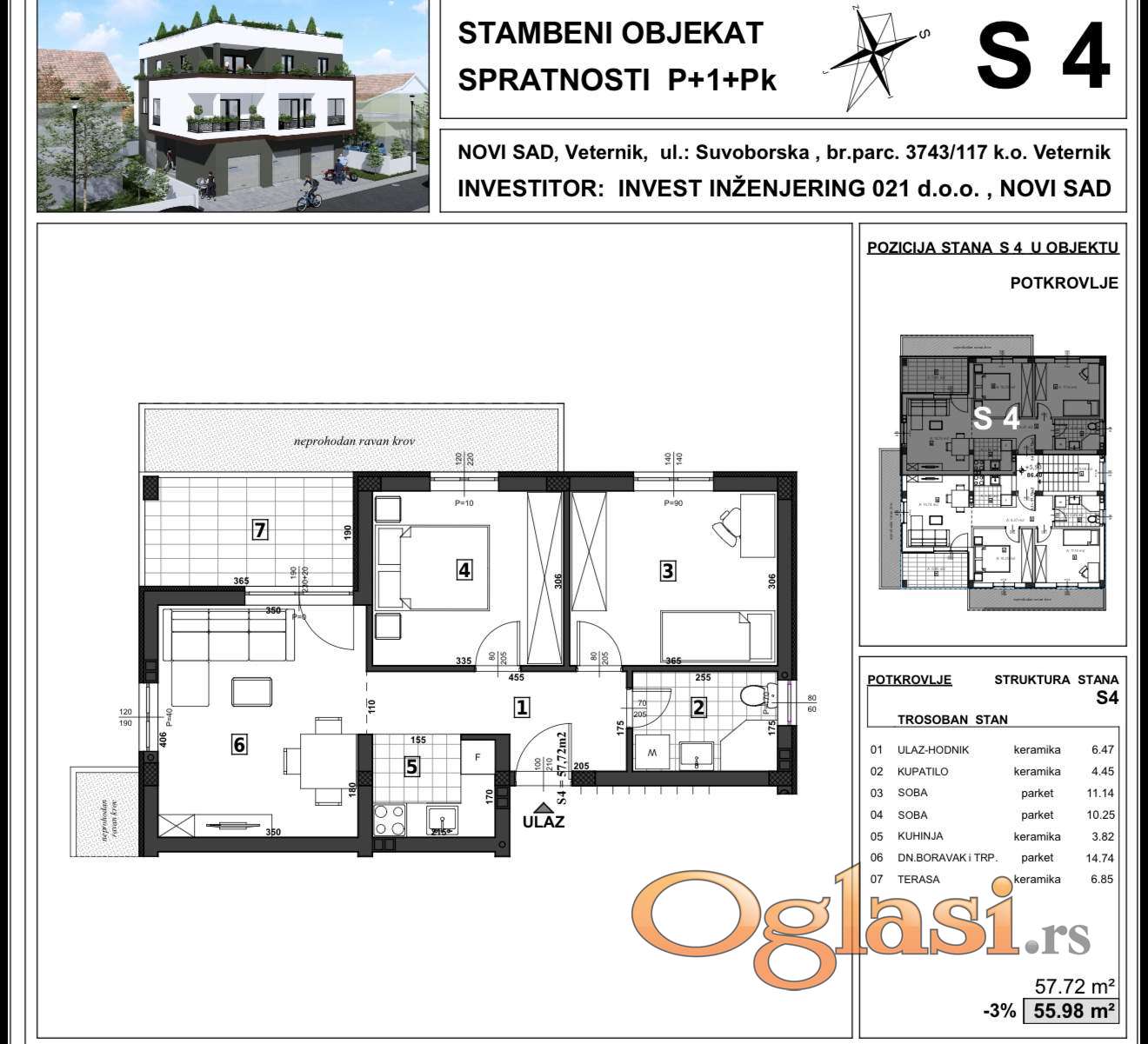 Prodaje se odličan trosoban stan u manjoj zgradi, na samoj granici Novog Sada i Veternika u lepoj i širokoj ulici, blizu svih urbanih sadržaja. Stan je dvorišno orijentisan. Stan se nalazi na drugom spratu urbane vile, kvalitetno građene po svim standardima modernog i komfornog stanovanja. Grejanje je podno na gas sa kalorimetrima. Stan ima dnevnu sobu i dve spavaće sobe, kupatilo, predsoblje i kuhinju koja je povezana sa dnevnom sobom i dve terase. Postoji mogućnost i pripajanja stanu veće krovne terase, po želji kupca. Investitor je siguran i pouzdan sa svom urednom dokumentacijom i dozvolama i za kupce prvog stana, može se ostvariti povrat Pdv-a od 10%. Rok završetka izgradnje je predviđen za oktobar 2026. godine.