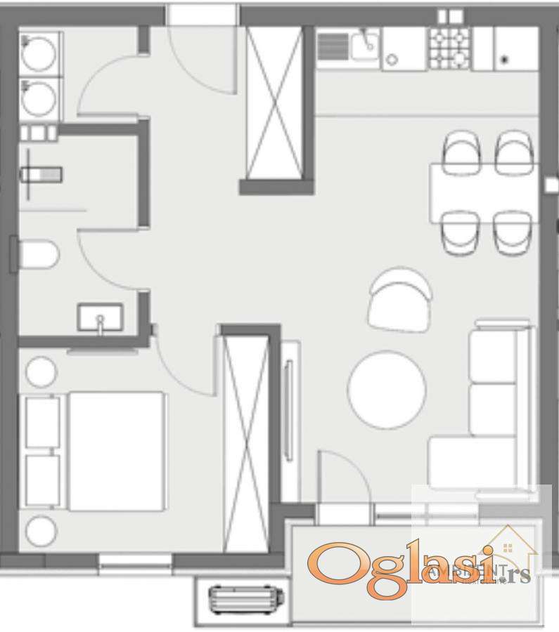 Ima 49.95 m2 i čine ga dnevna soba sa kuhinjom i trpezarijom, spavaća soba, hodnik, vešernica, kupatilo i terasa.