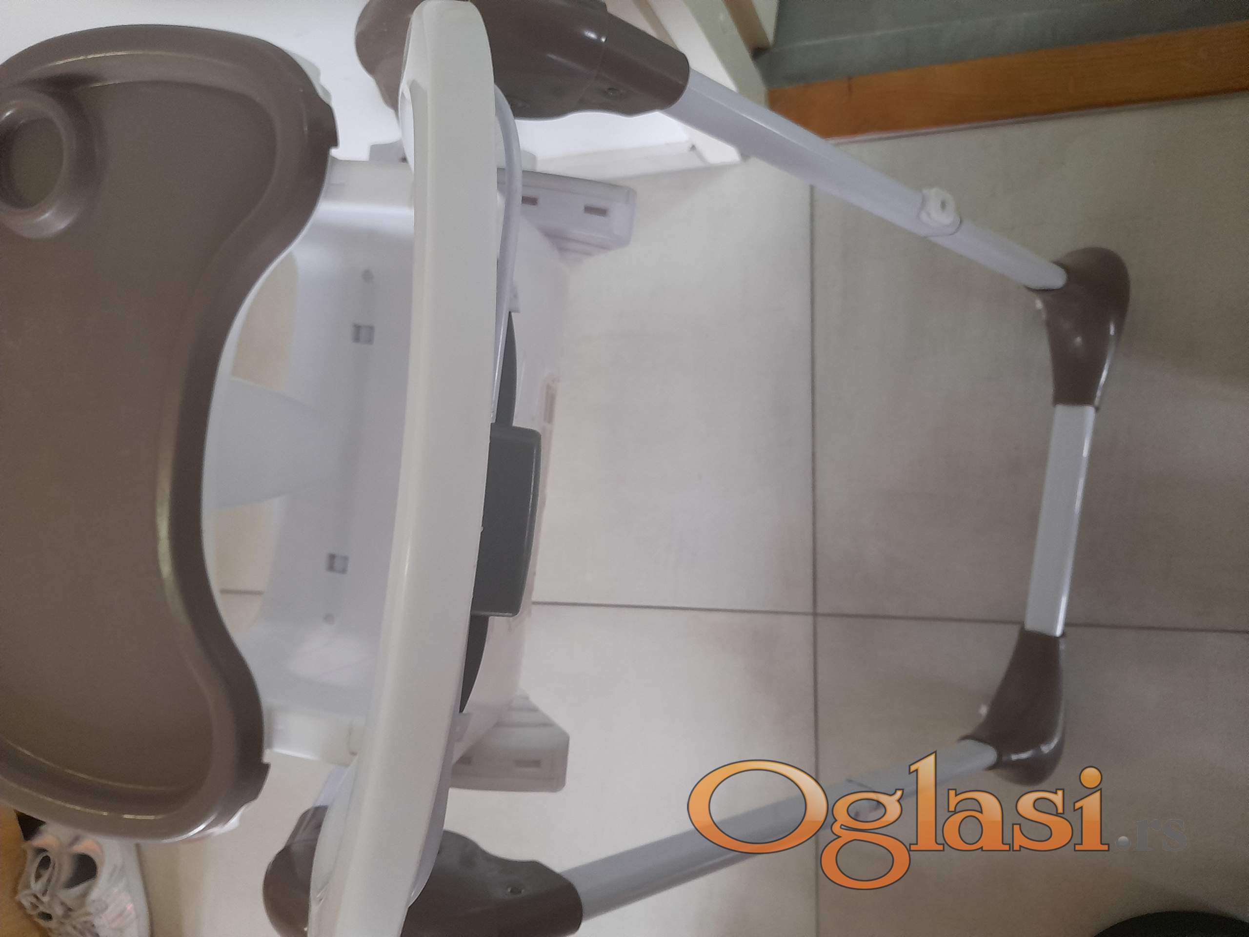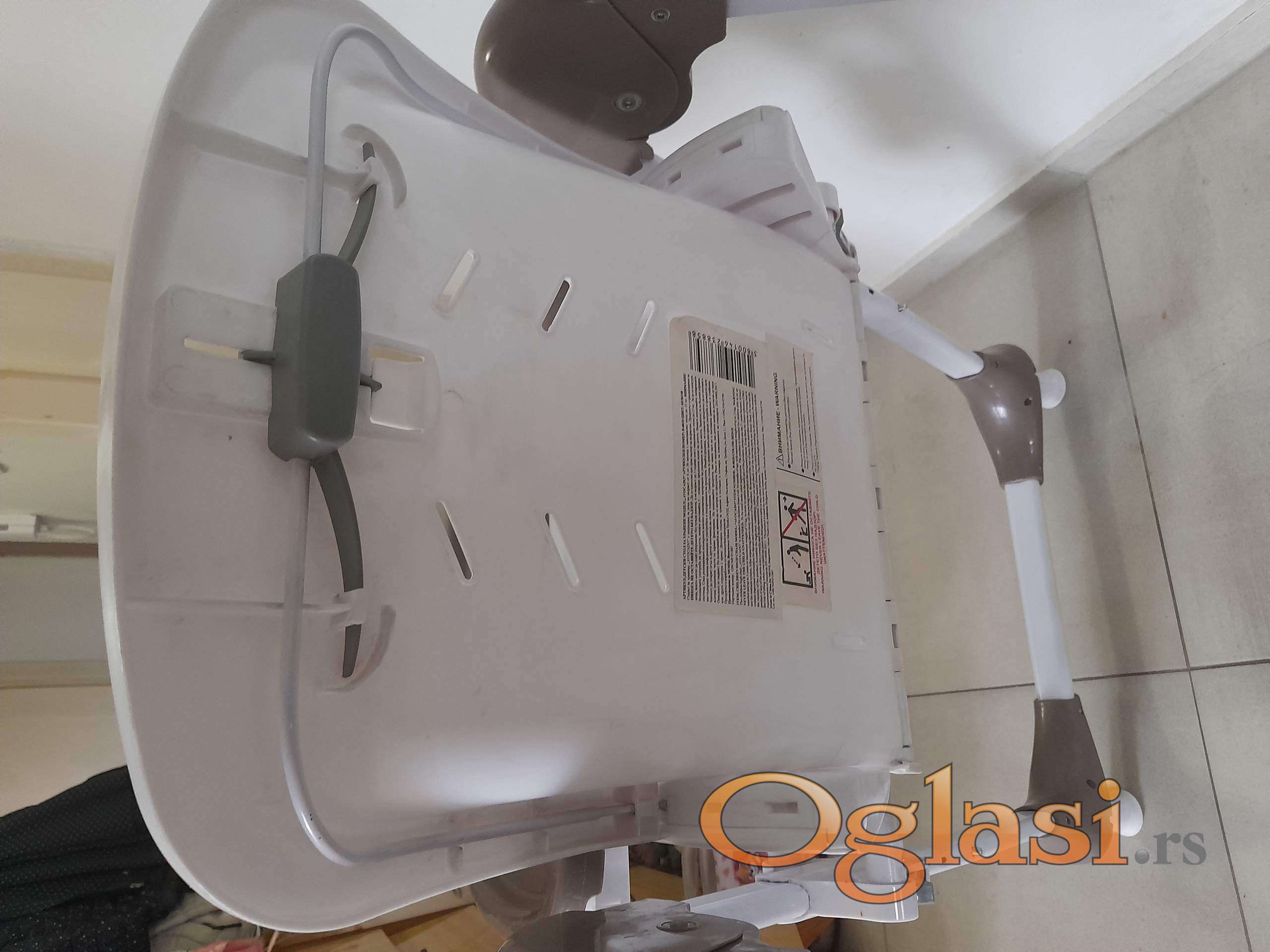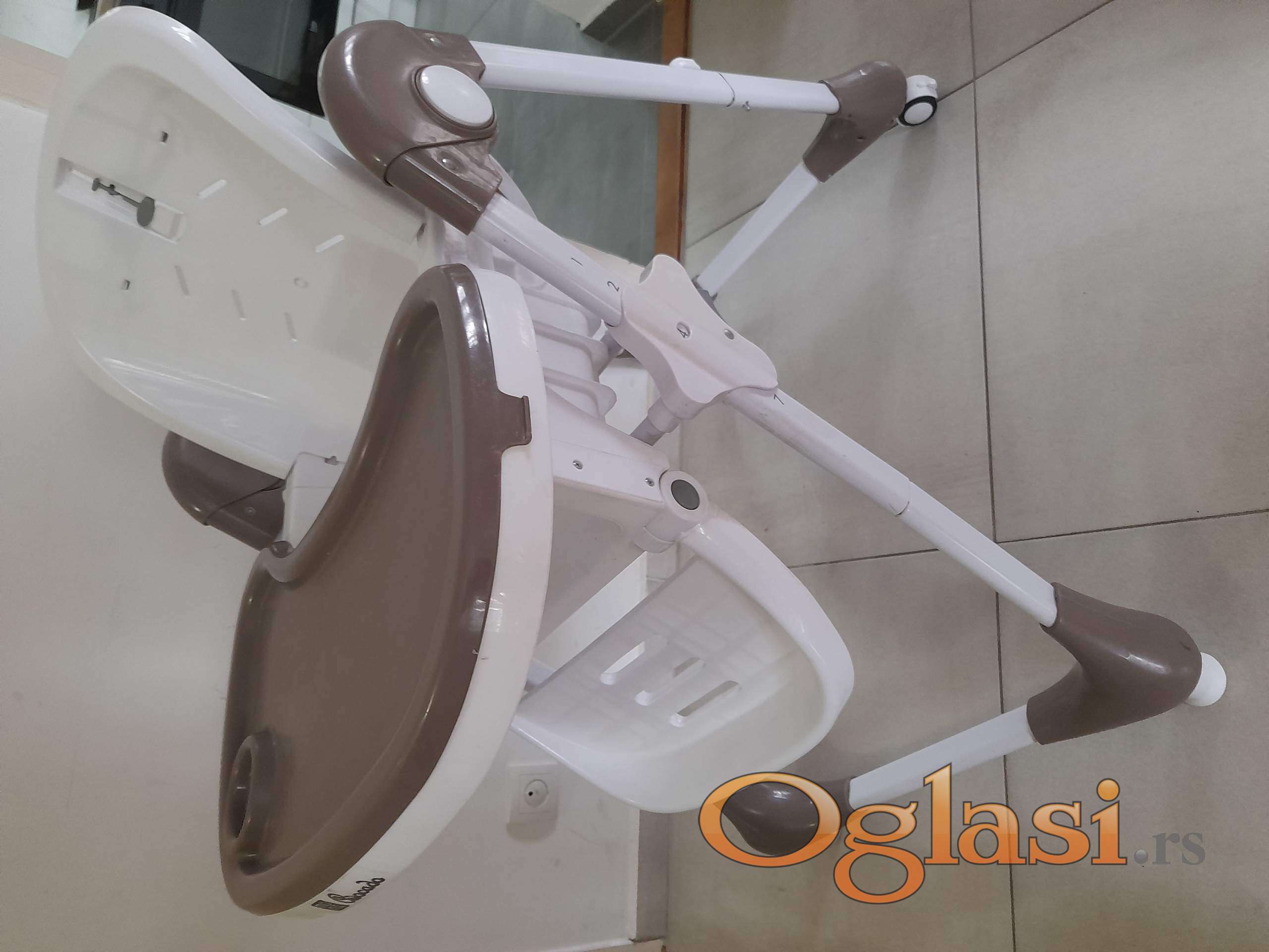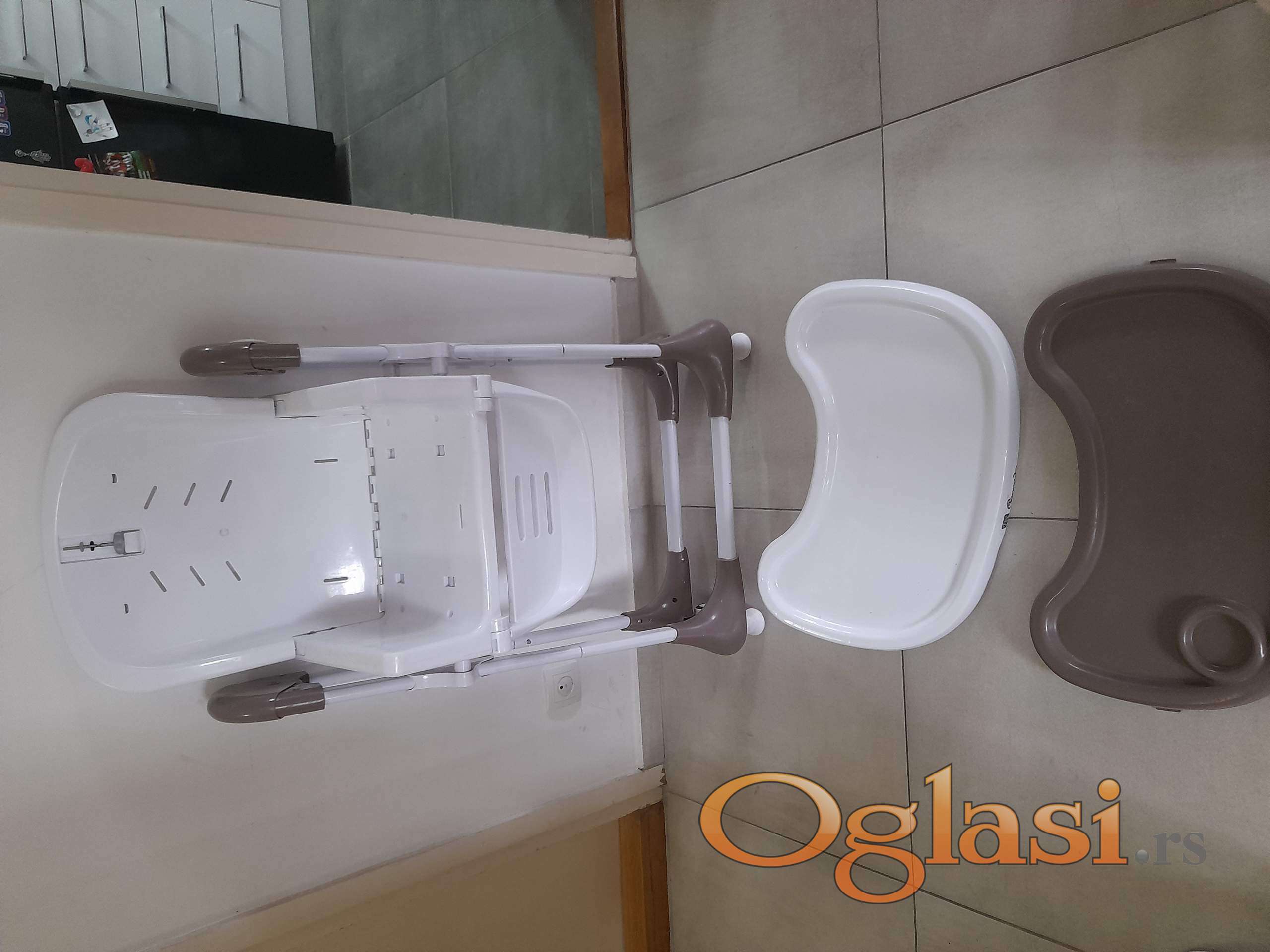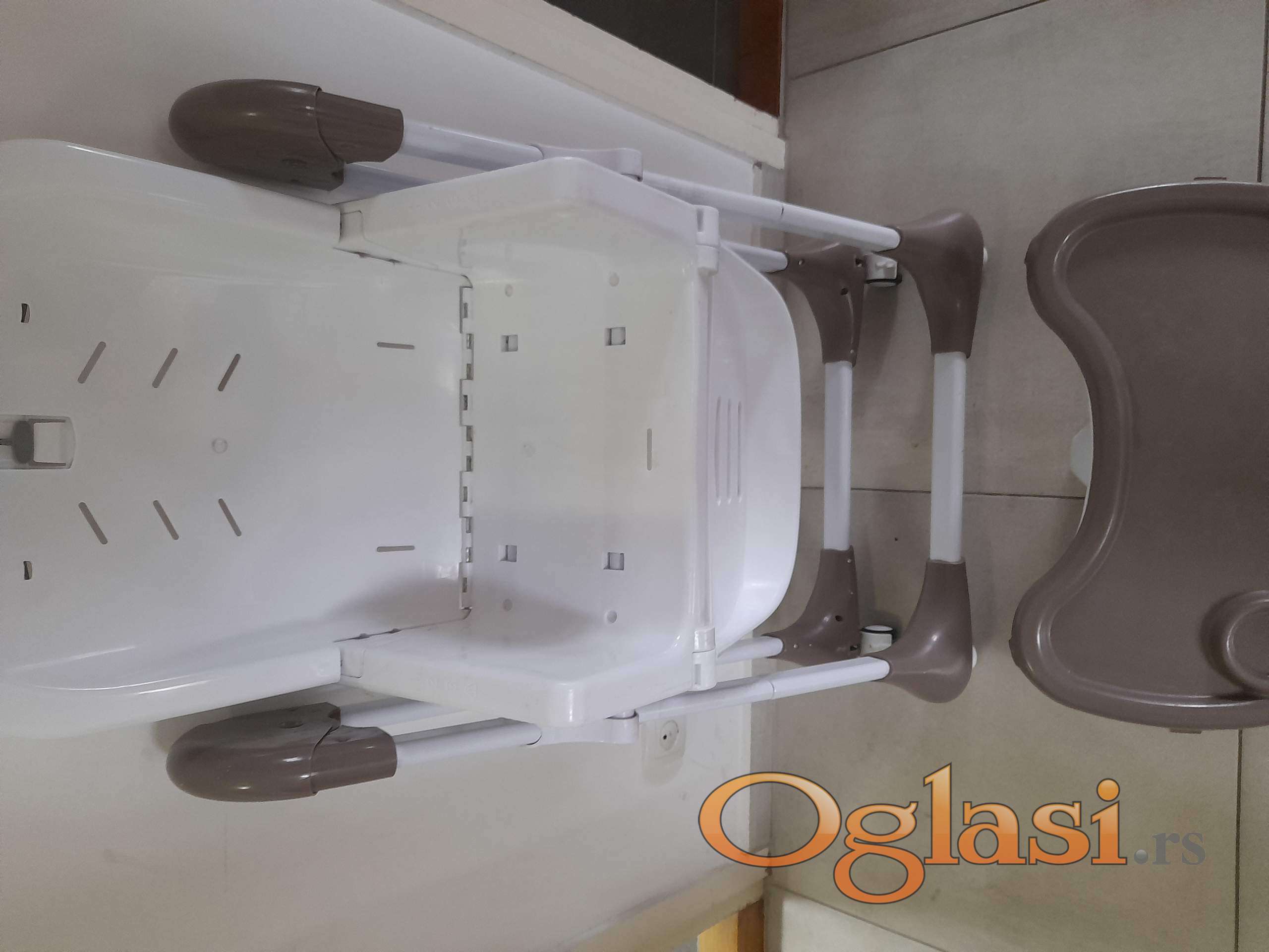 Zgodna hranilica koja se može podešavati 7 položaja visine, naslon u 3 položaja, oslonac za noge u više položaja. 2 tacne koje se skidaju. Kao nova, samo nema navlaku
