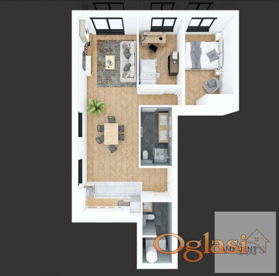 Ulazni hodnik, prostrana dnevna soba sa trezarijom i kuhinjom, dve spavaće sobe, veliko kupatilo i toalet (vešernica).