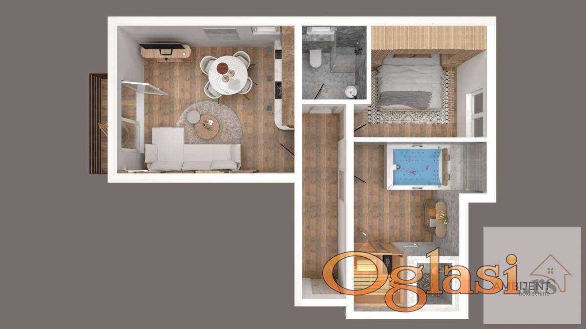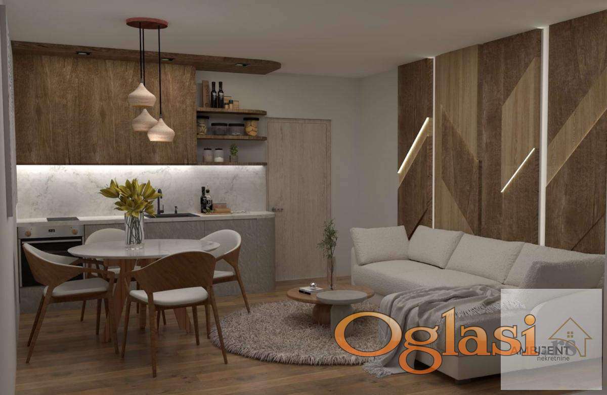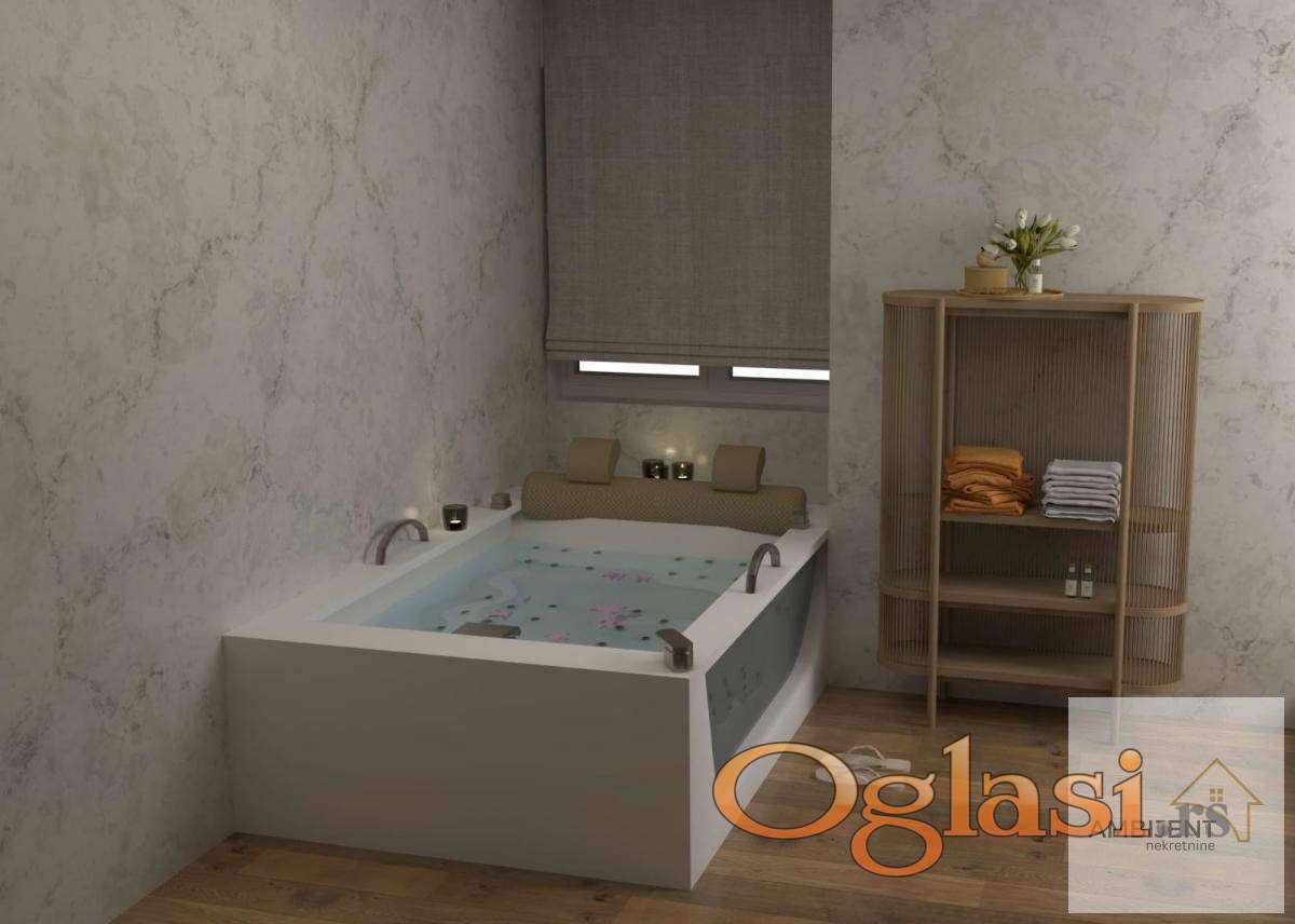 Poseduje dnevnu sobu sa kuhinjom i tepezarijom, terasu sa prelepim pogledom, hodnik, kupatilo i dve spavaće sobe od kojih se po želji kupca jedna može opremiti kao mini SPA centar.